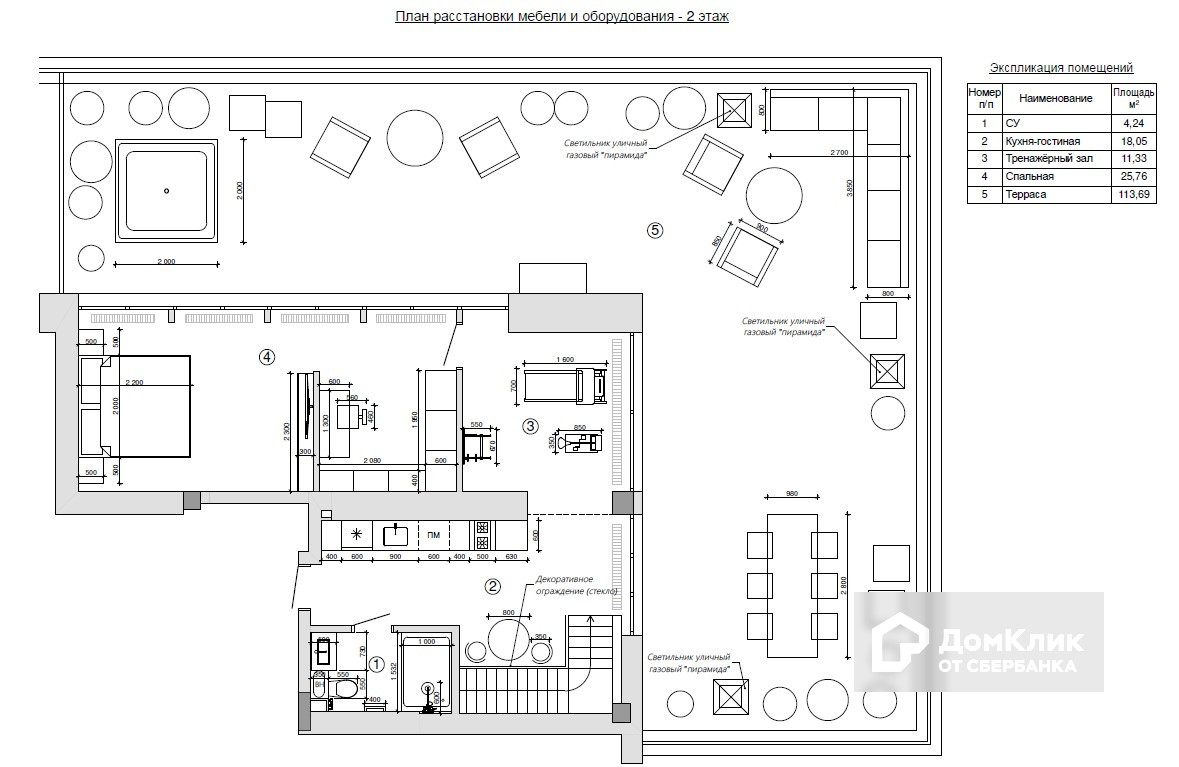 2 этаж: кухня-гостиная, спальня, тренажерный зал, с/у, терраса.