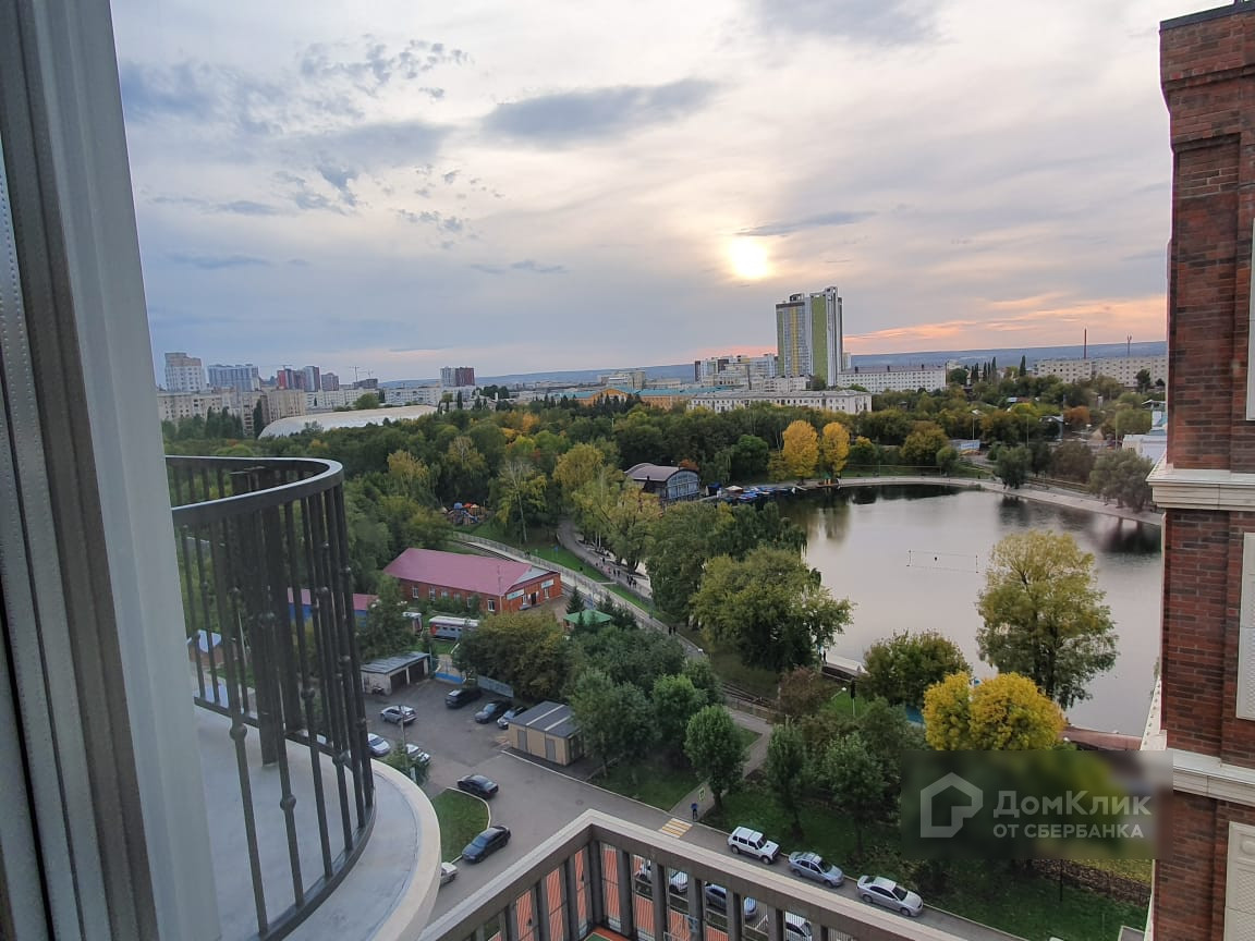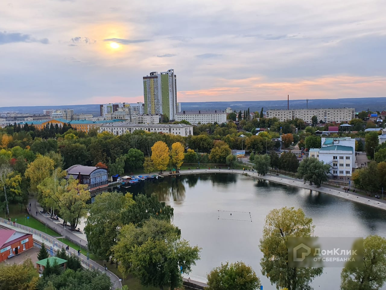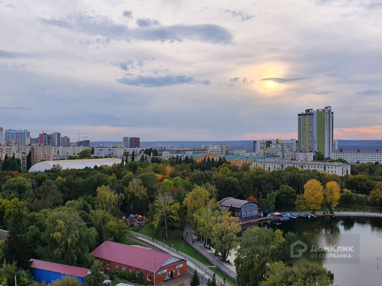 Красивый панорамный вид с высокого этажа на красивый двор и парк с озером.