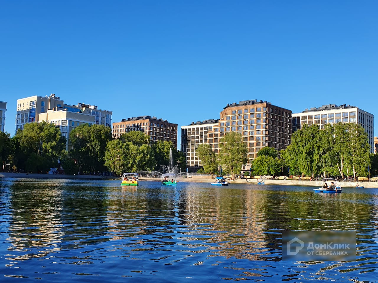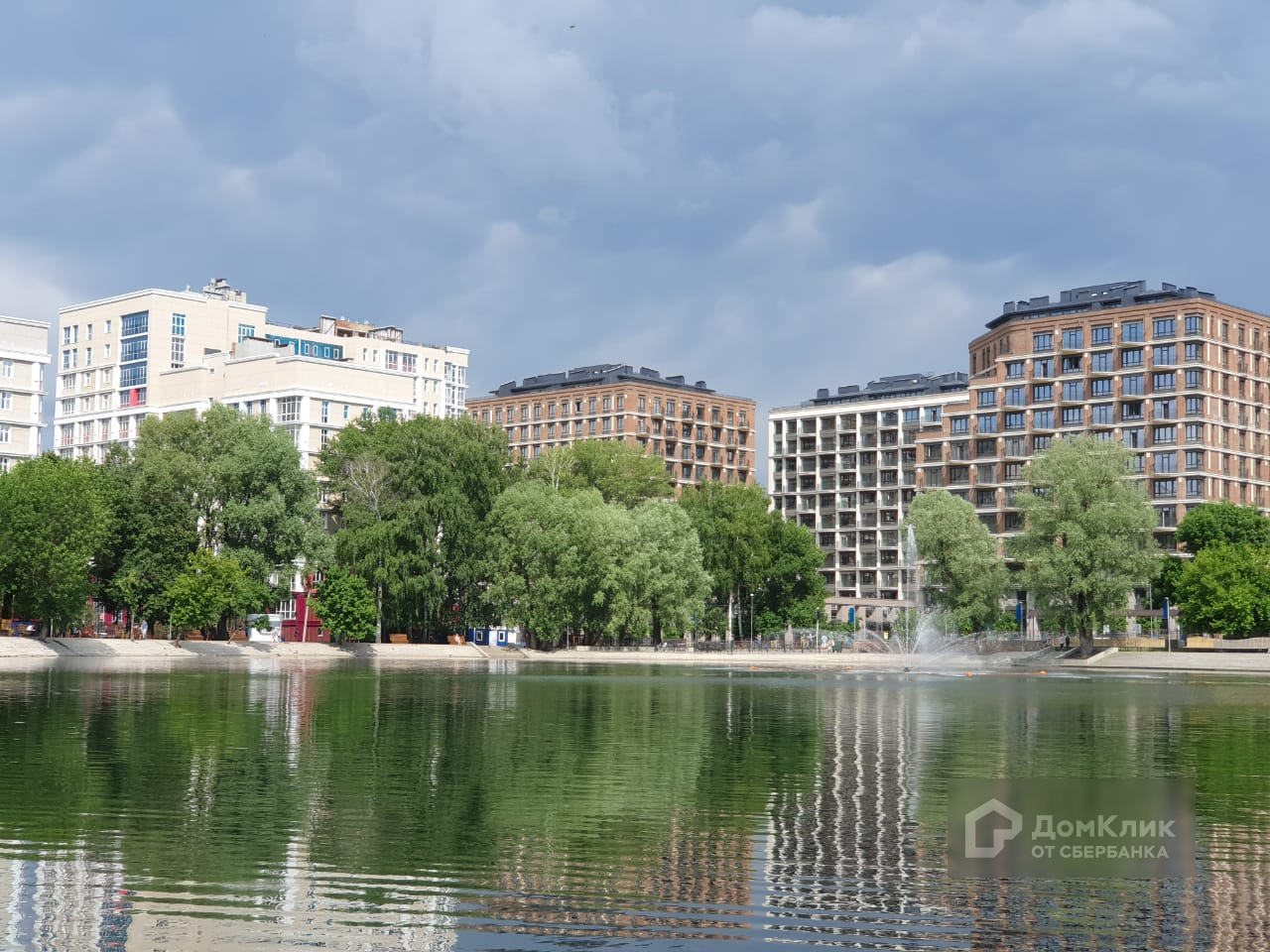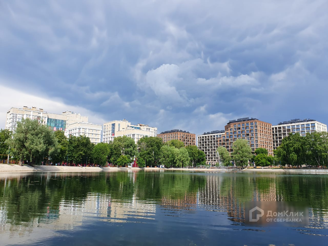 Красивый панорамный вид с высокого этажа на красивый двор и парк с озером.