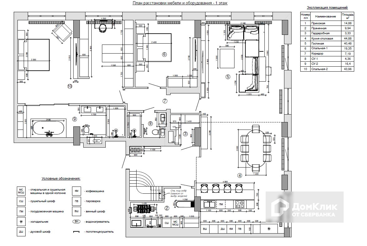 1 этаж: кухня-столовая 45 кв.м., гостиная 41 кв.м., 2 спальни, 2 с/у, гардеробная, прачечная.
