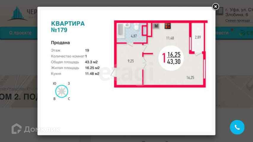 Общая площадь квартиры 43,3 м2, жилая 16,25 м2, кухня 11,48 м2.