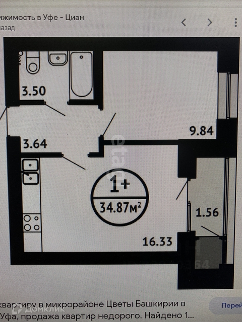 1-комнатная квартира, 34.9 м2, этаж 2 / 6, на продажу в Уфе
