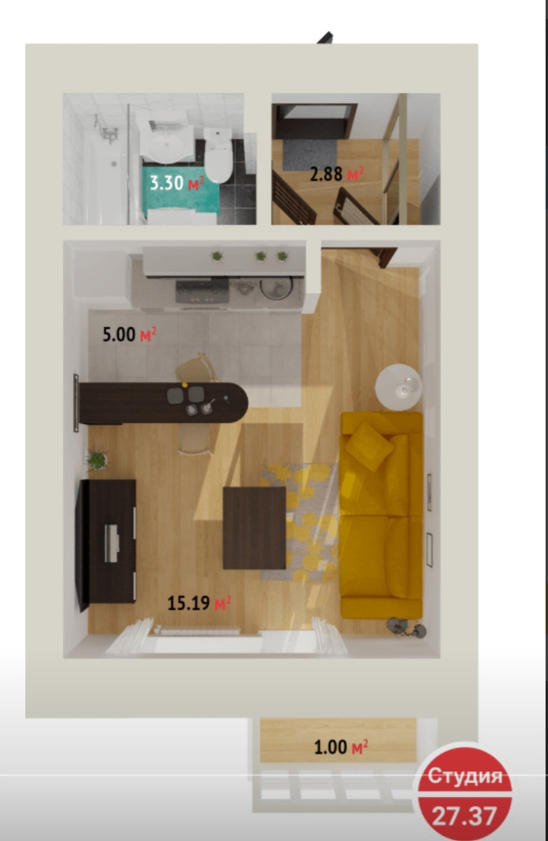Общая площадь 27.4 м2