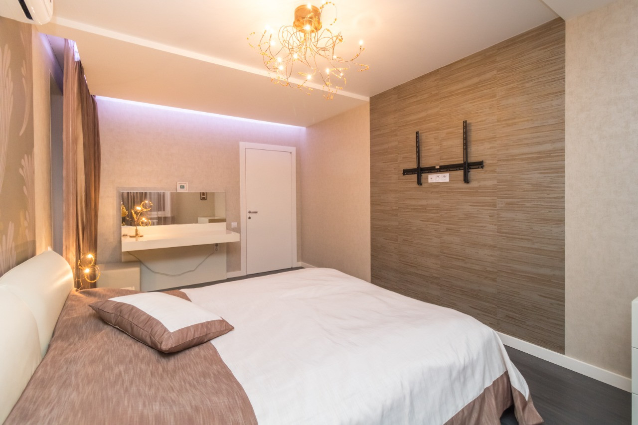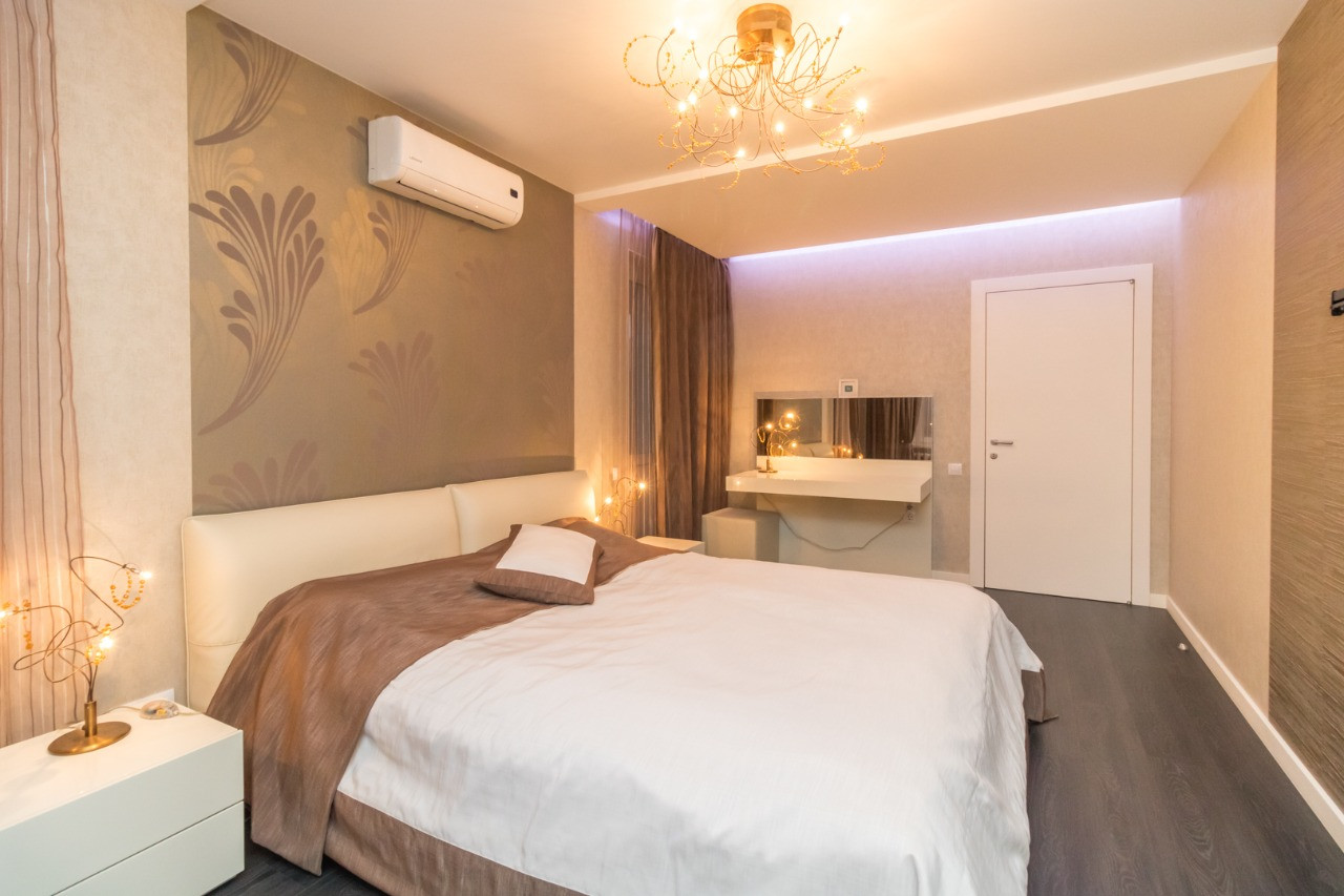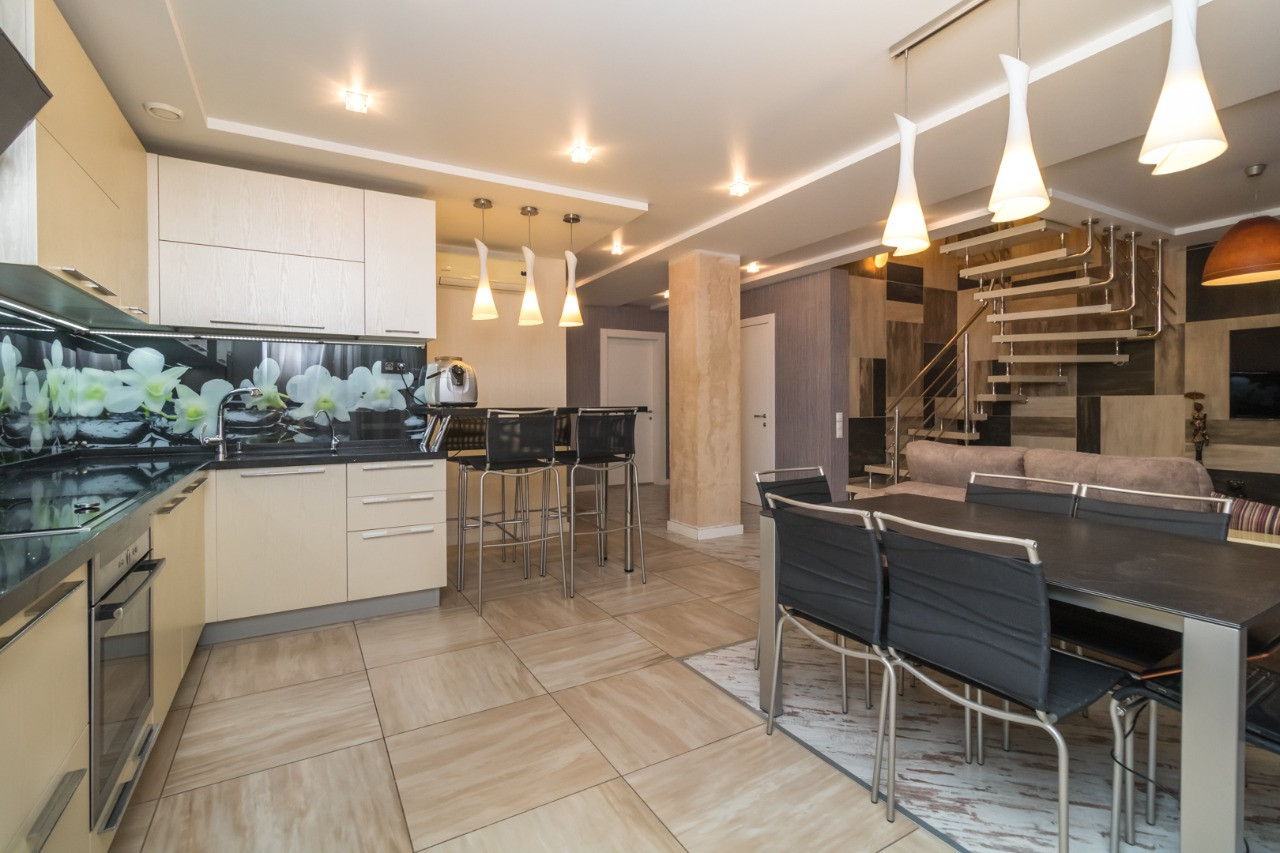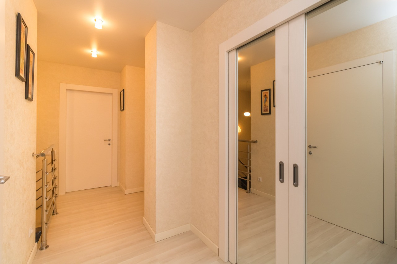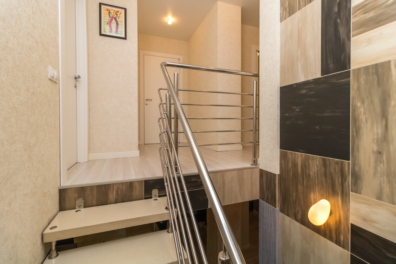 В квартиры выполнен современный качественный ремонт из дорогих импортных материалов: на полу испанский керамогранит и ламинат производства Норвегии, идеально выровненнные стены и полы, лестница из натурального камня; все люстры испанские из каталога; души и краны немецкие; на 1 этаже душевая кабина; на 2 этаже ванна джакузи с гидромассажем; кухонный гарнитур со столешницей из натурального камня; барная стойка; встроенный шкаф в коридоре; встроенная мебель и техника; Кондиционеры и водонагреватели; полностью оборудована гардеробная и кладовая; все балконы застеклены, оштукатурены, на полу плитка.