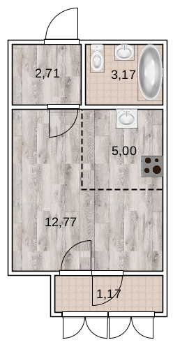 Квартира-студия, расположенная по адресу: ул. Бородинская, д. 24, 2/8 этажность. Общая площадь 25,3 м2.
