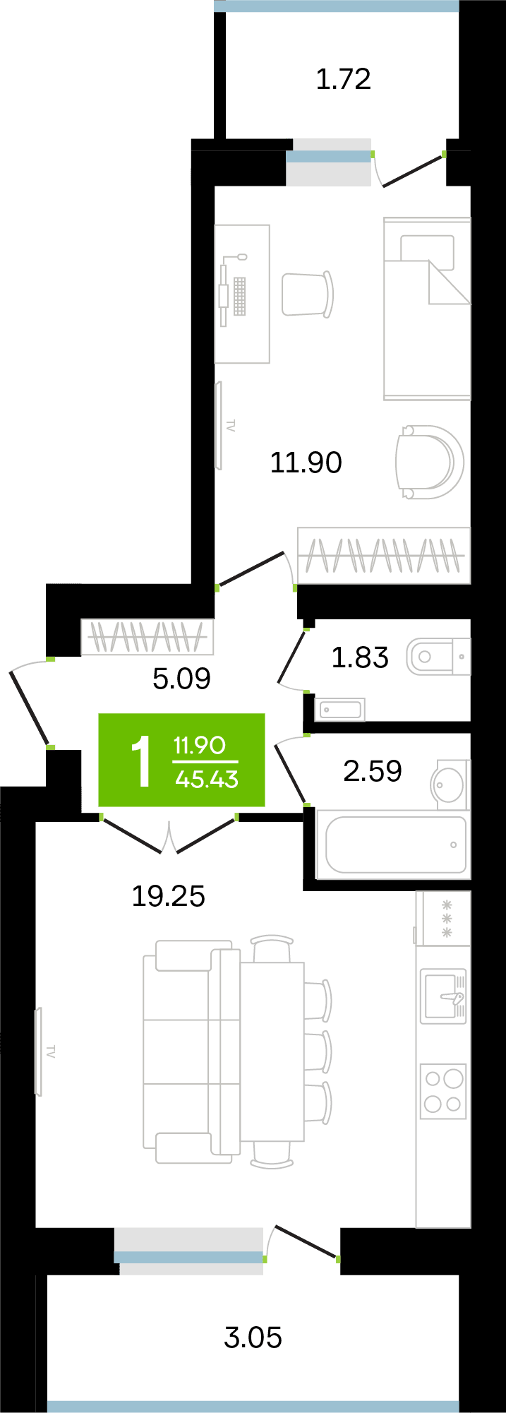 Общая площадь 45.43 м2
