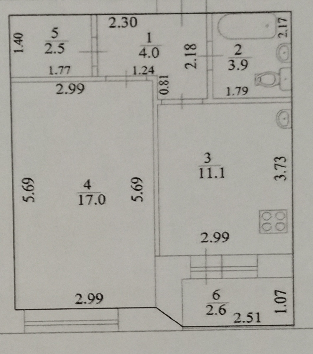 Общая площадь- 44,6 кв.м.: комната 17 кв.м., кухня- 11.10 кв.м., гардеробная 2.50 кв.м., коридор 4 кв.м., санузел 3, 9 кв.м., лоджия застекленная 6 кв.м. Отличное планировка большая кухня, есть отдельня гардеробная.