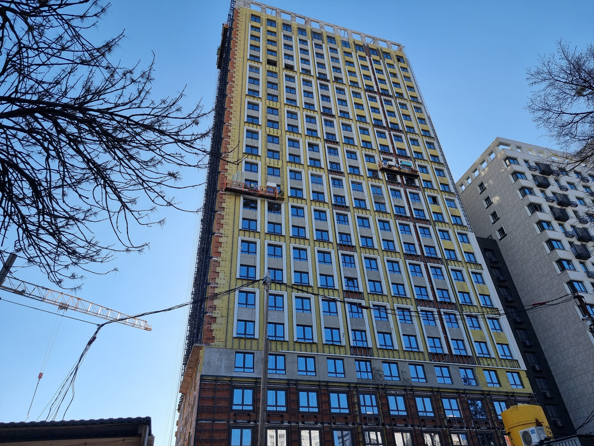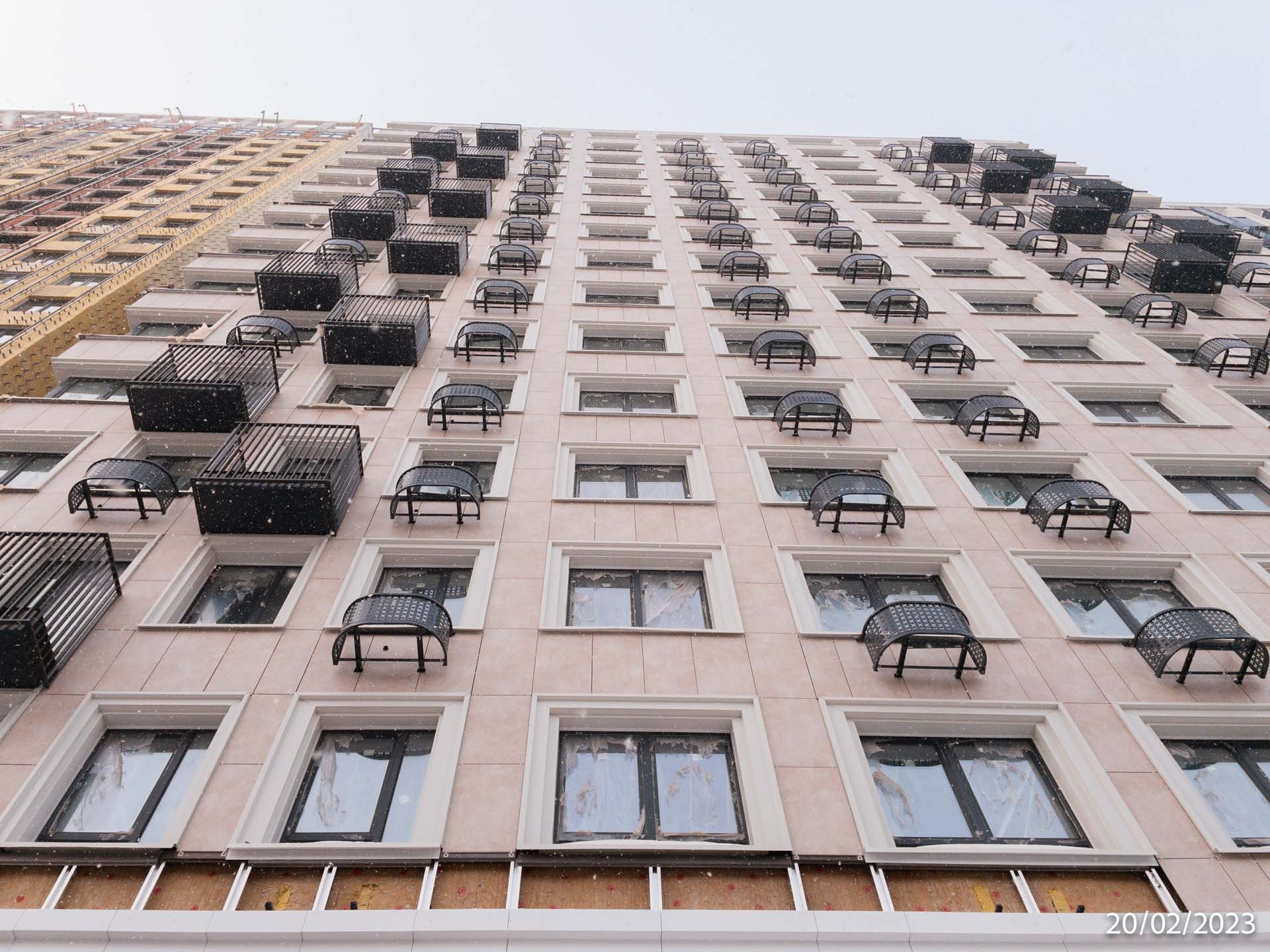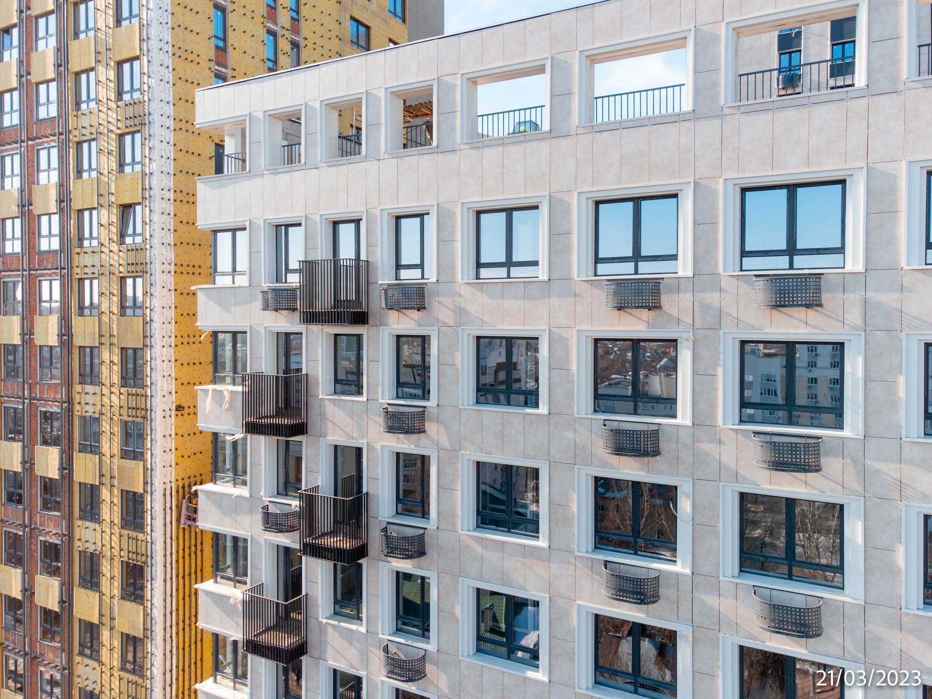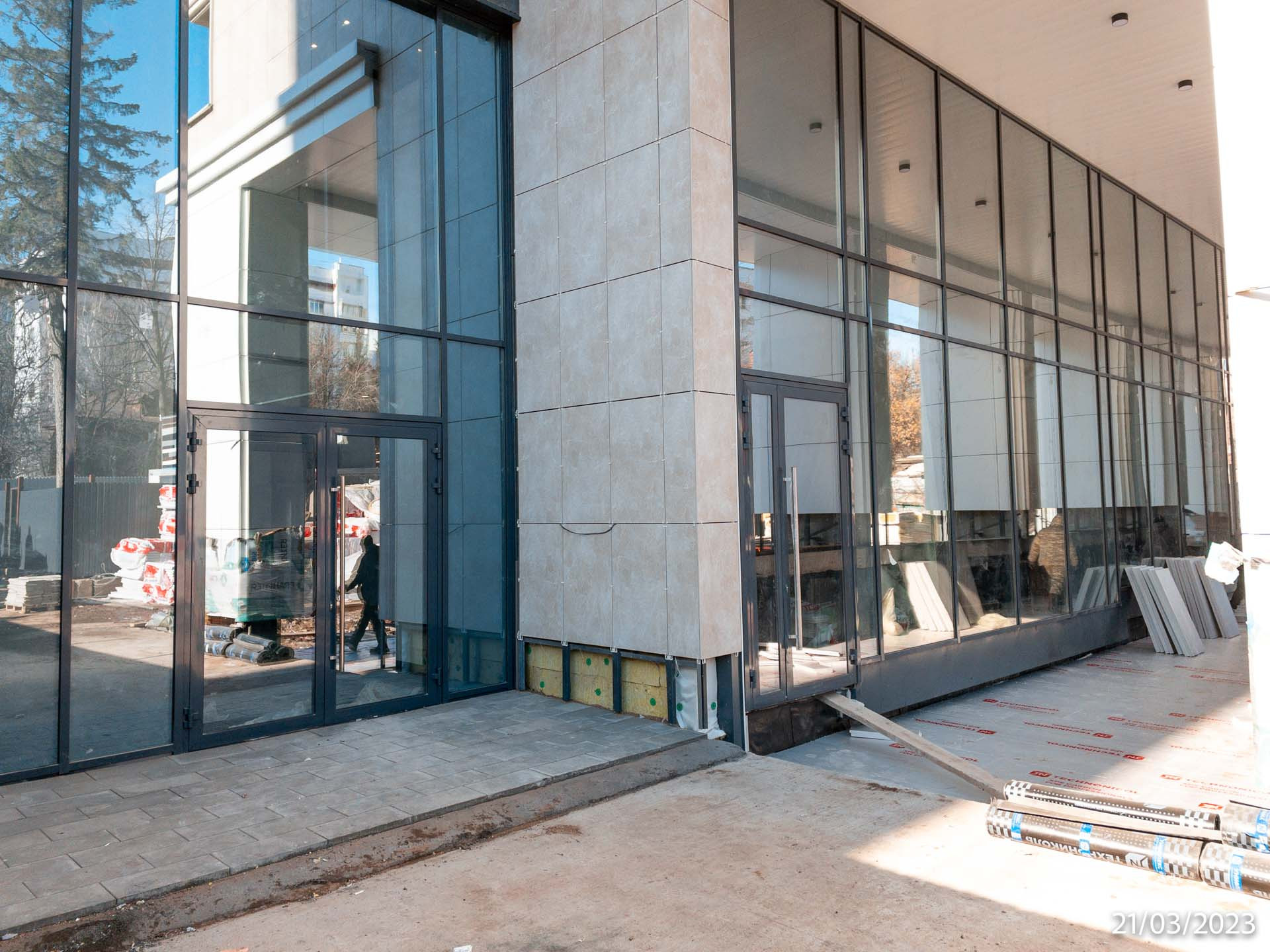 Фасады выполнены керамогранитными плитами и композитными панелями, которые обеспечивают надежность и долговечность конструкции.