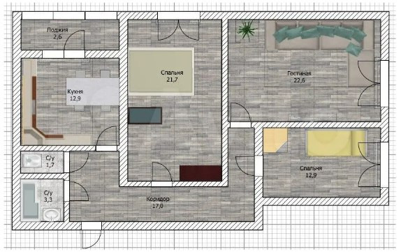 Изолированные комнаты: 22,6 кв м, 21,7 кв м и 12,9 кв м