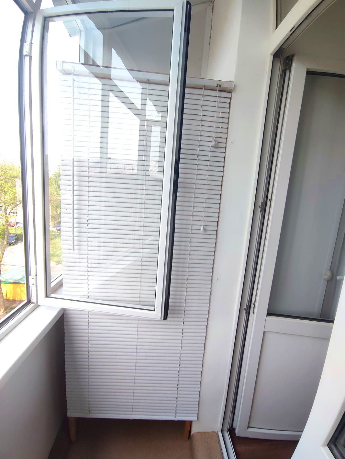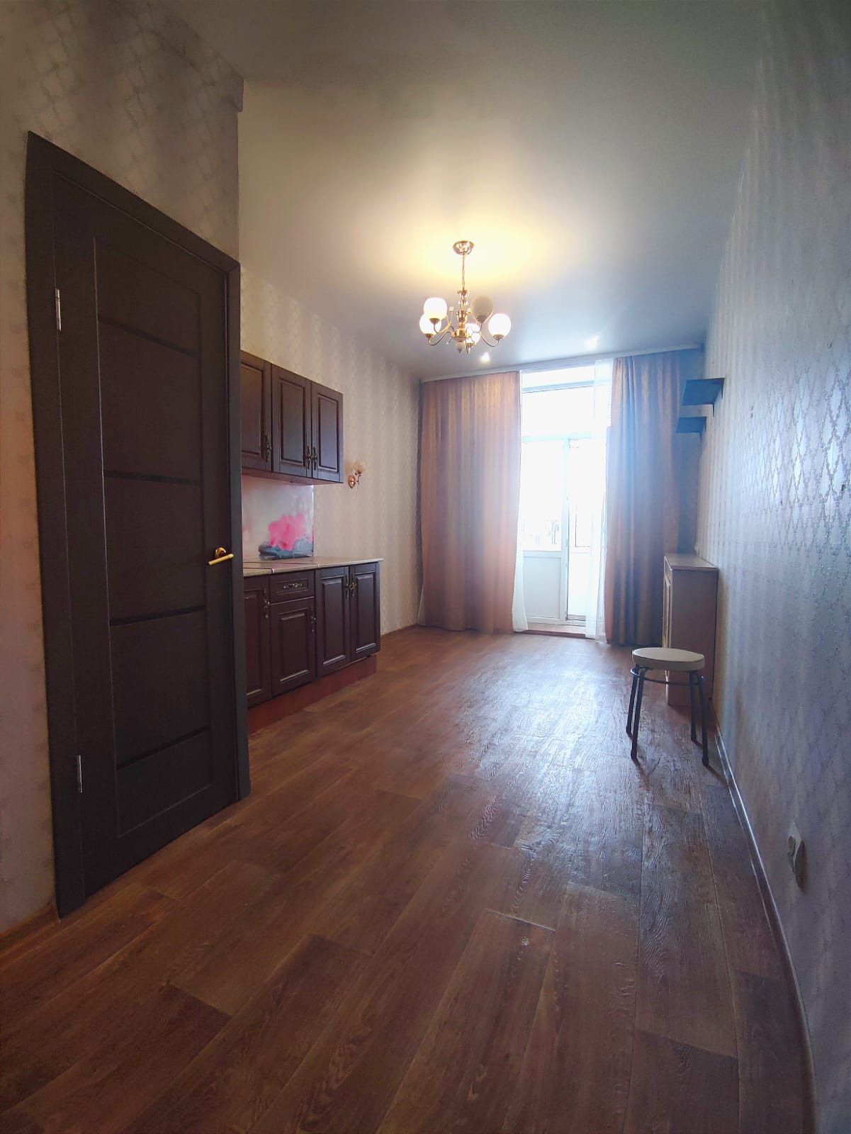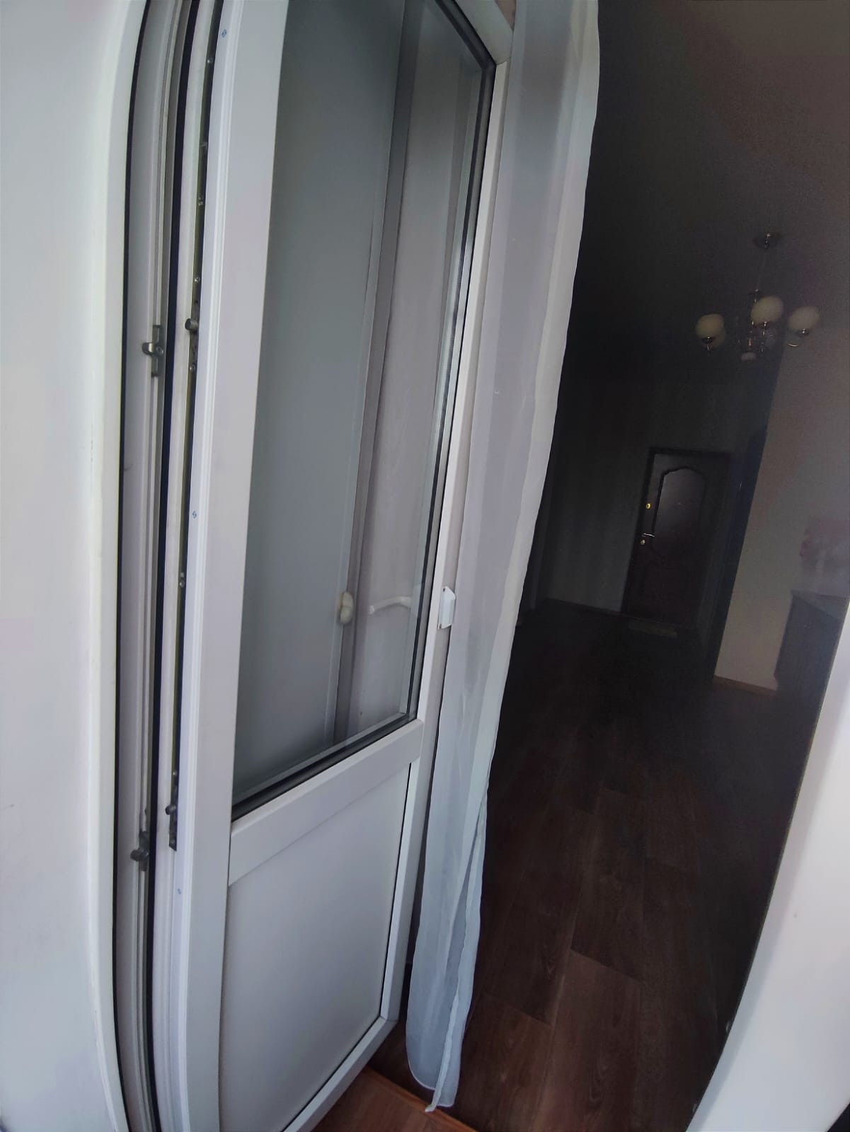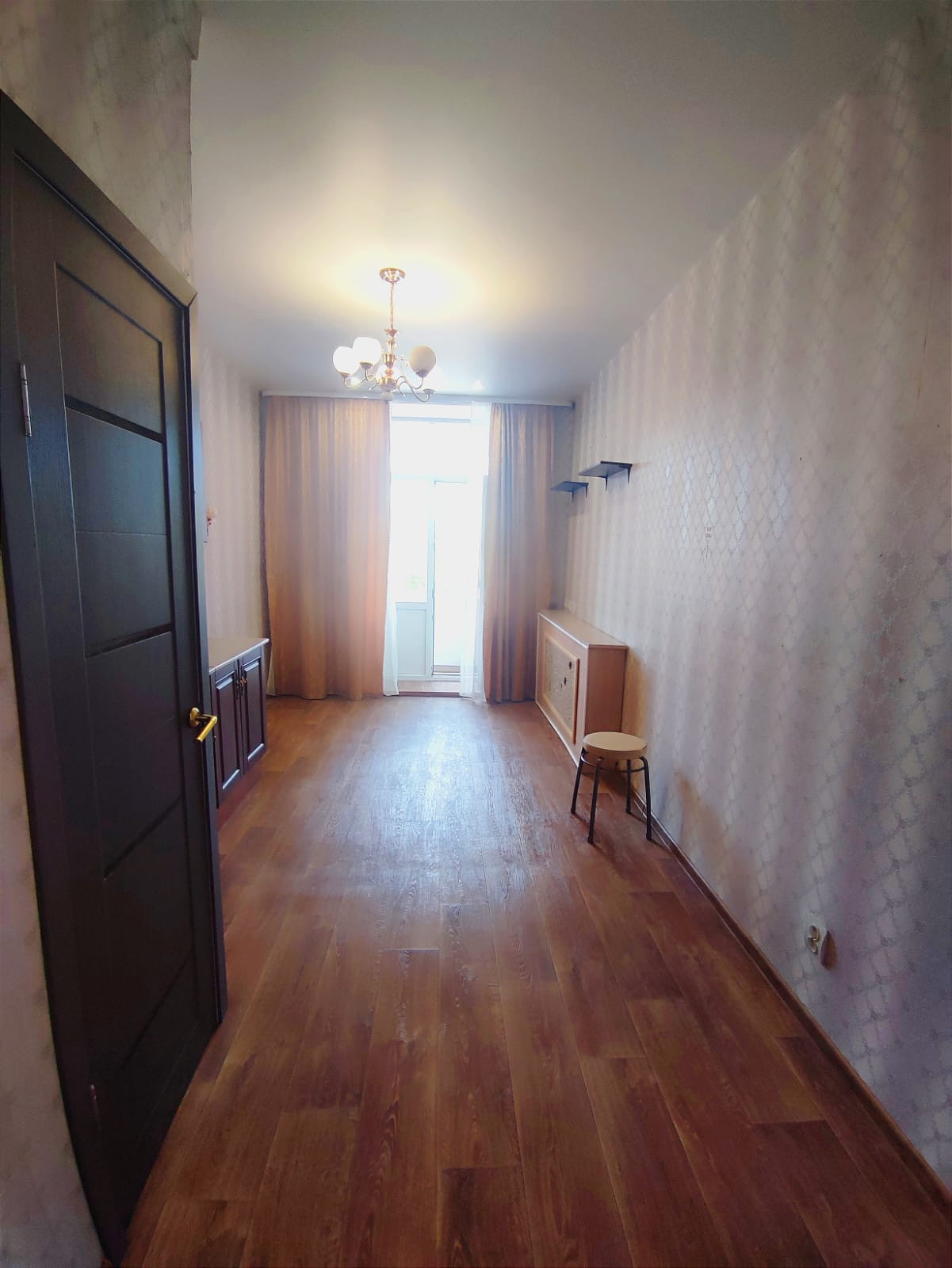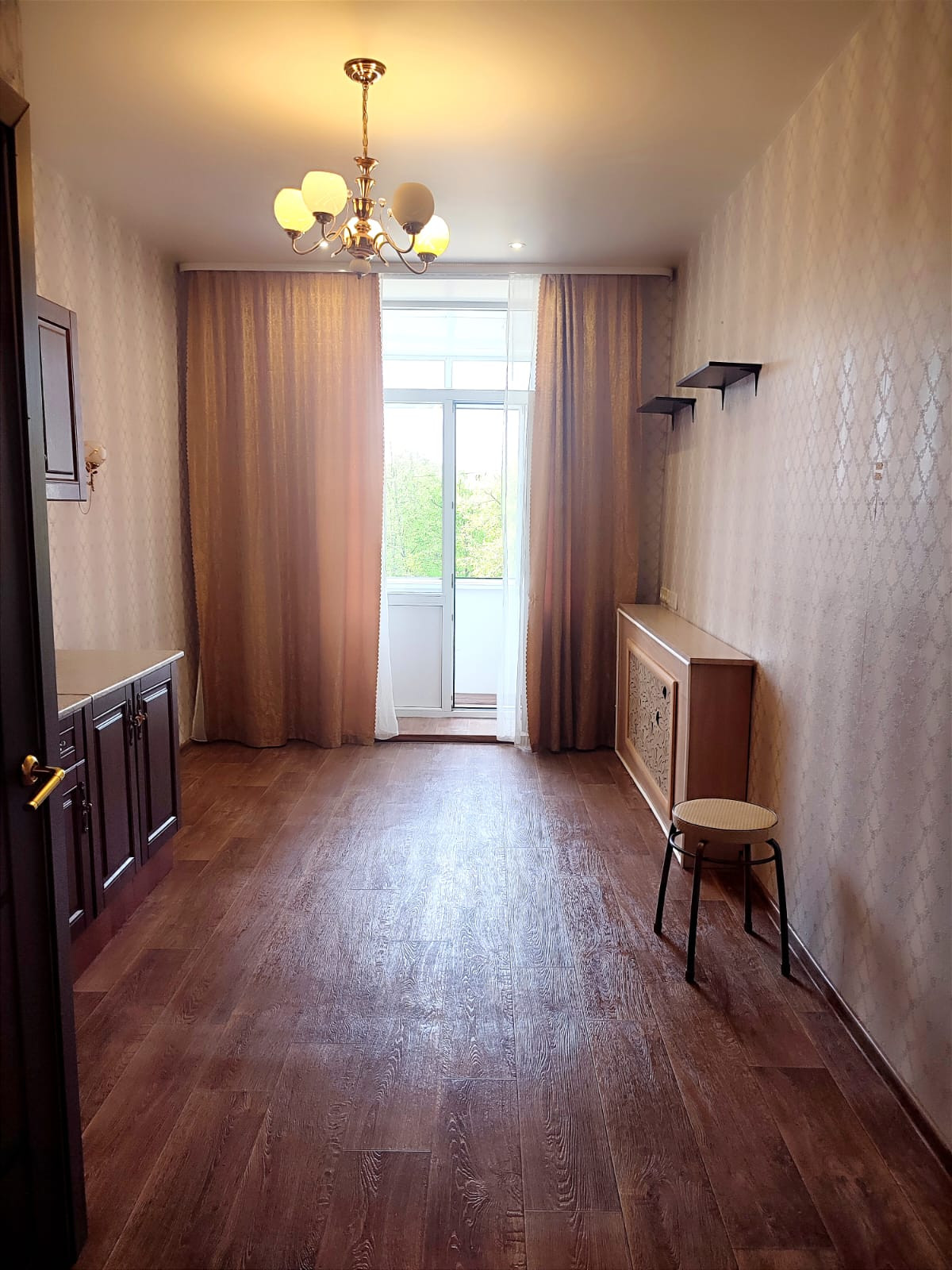 Натяжной потолок, линолеум на полу, выход на балкон застеклен пластиковой дверью( выход во двор)