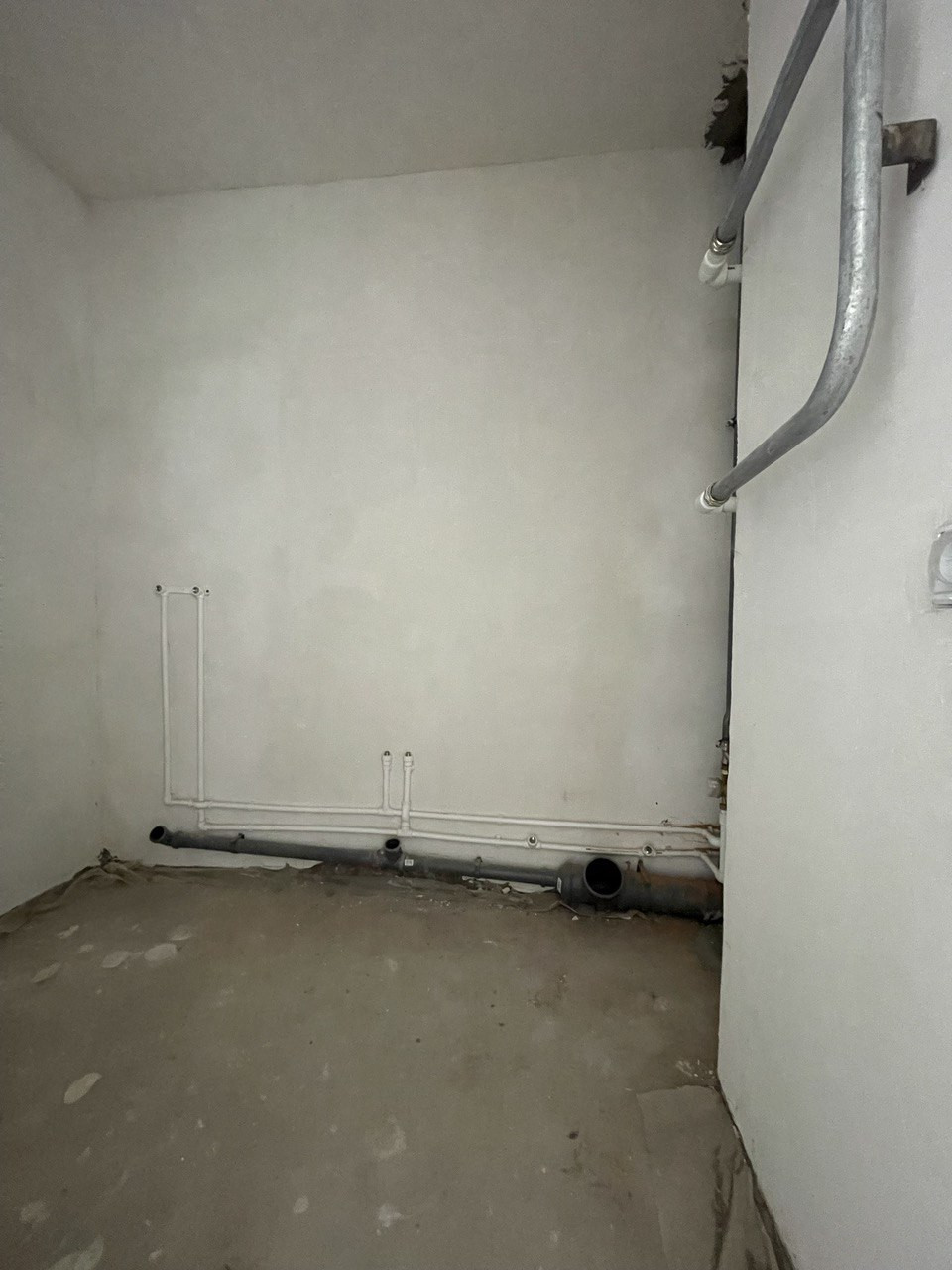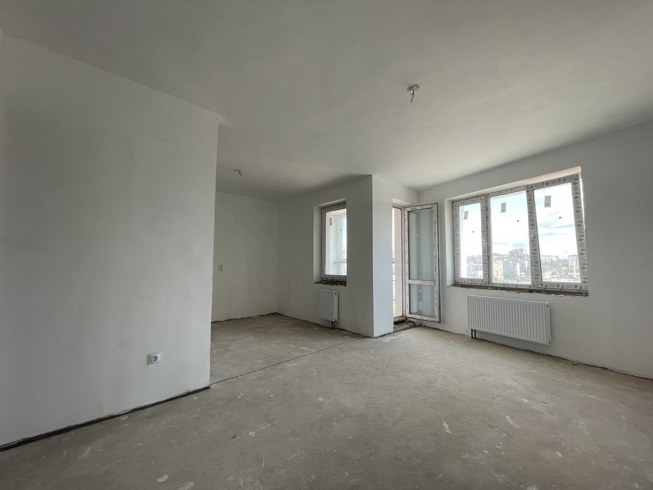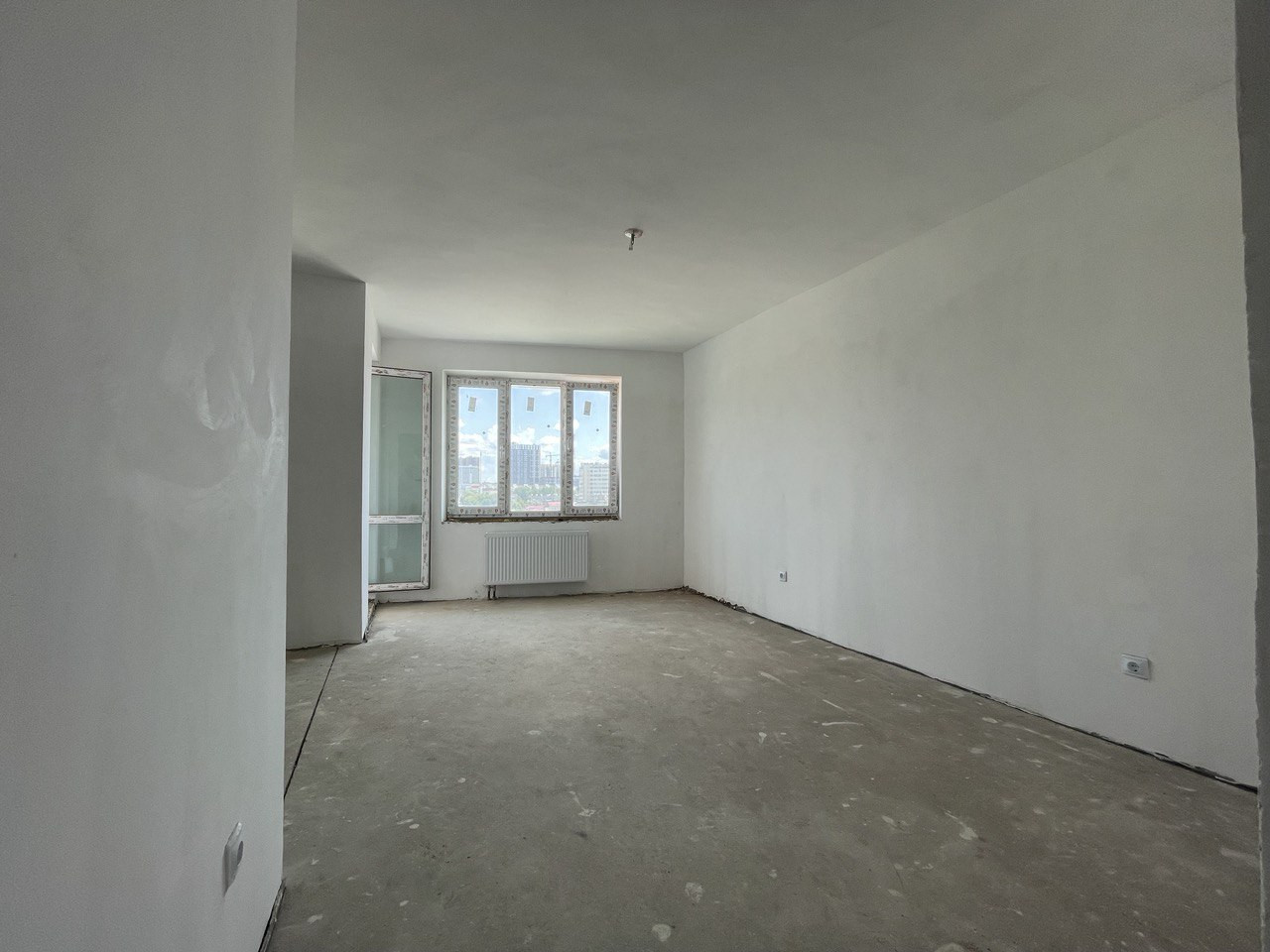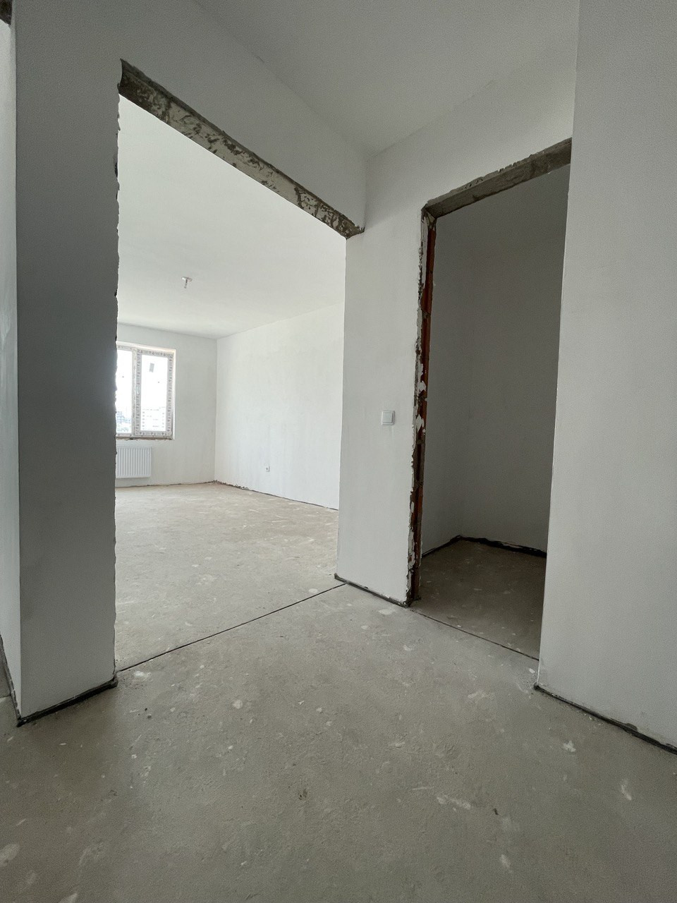 Отделка получистовая: -ровные стены по маякам; -сухая стяжка пола; -радиаторы; -проводка; -входная железная дверь;