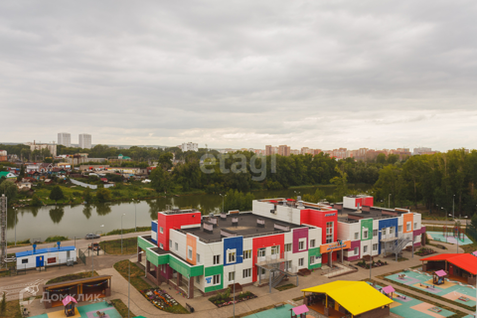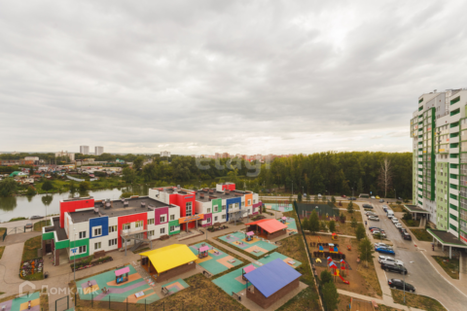 Вид на парковую зону, озеро и детский сад, сторона не солнечная.
