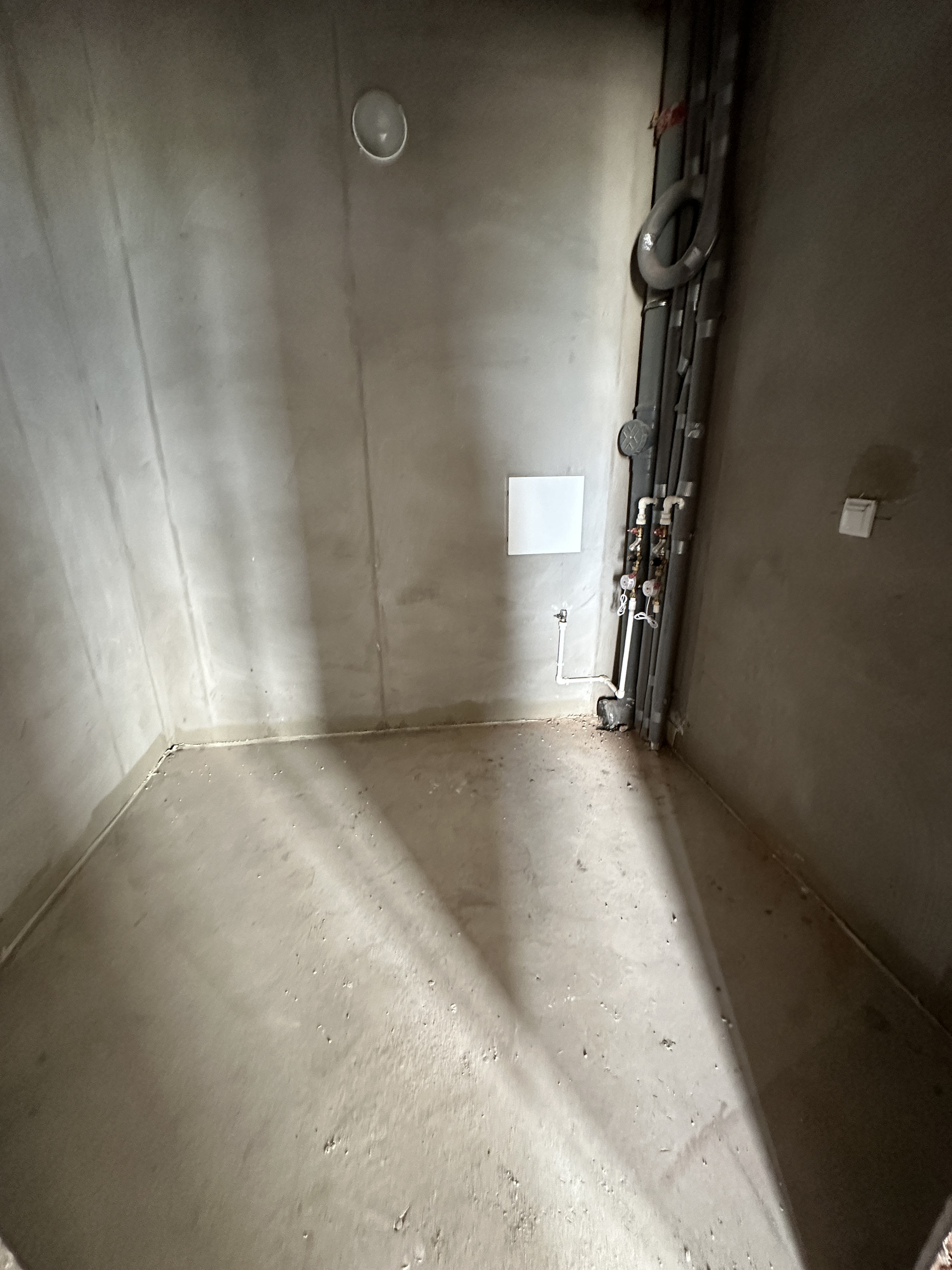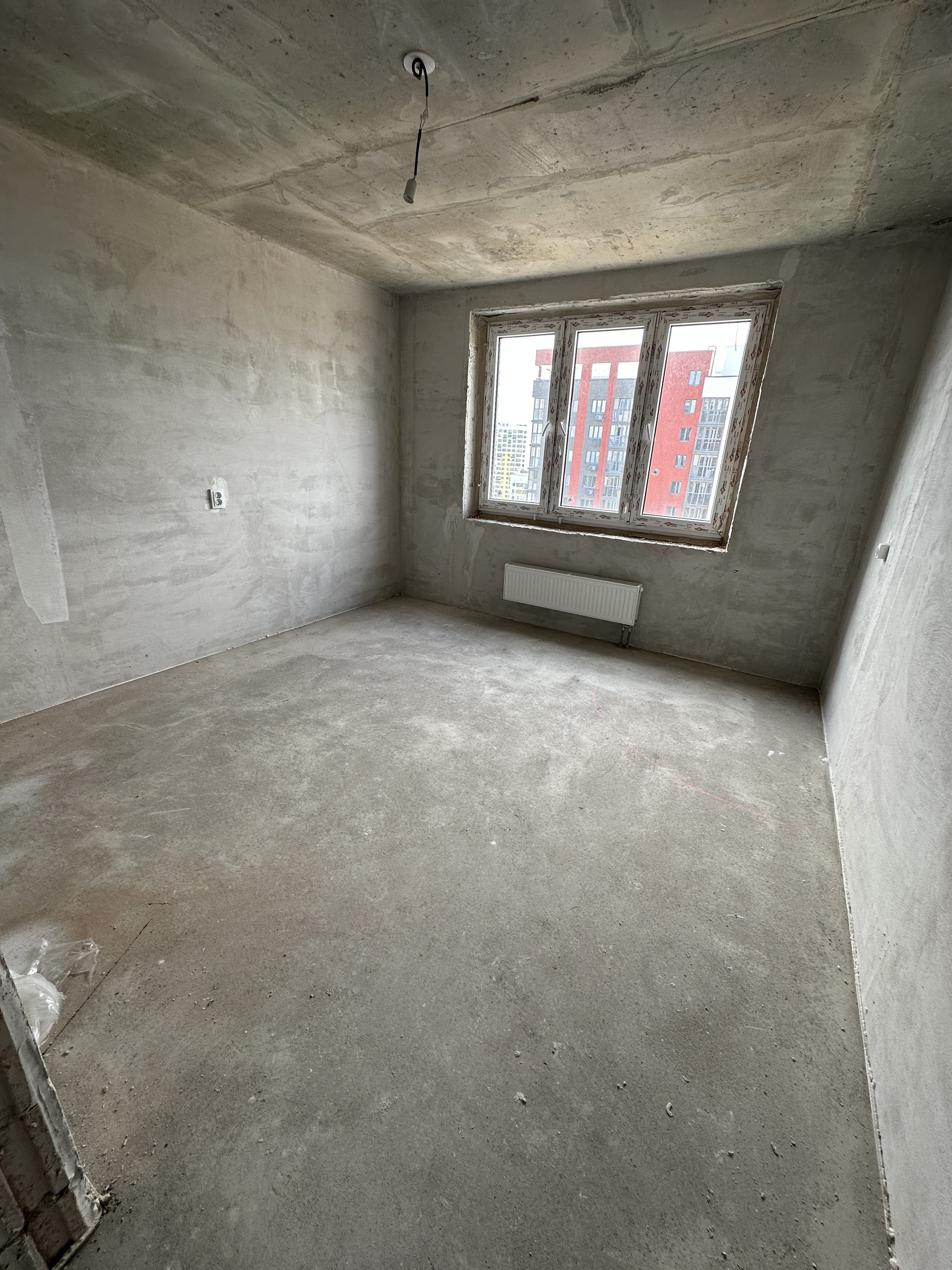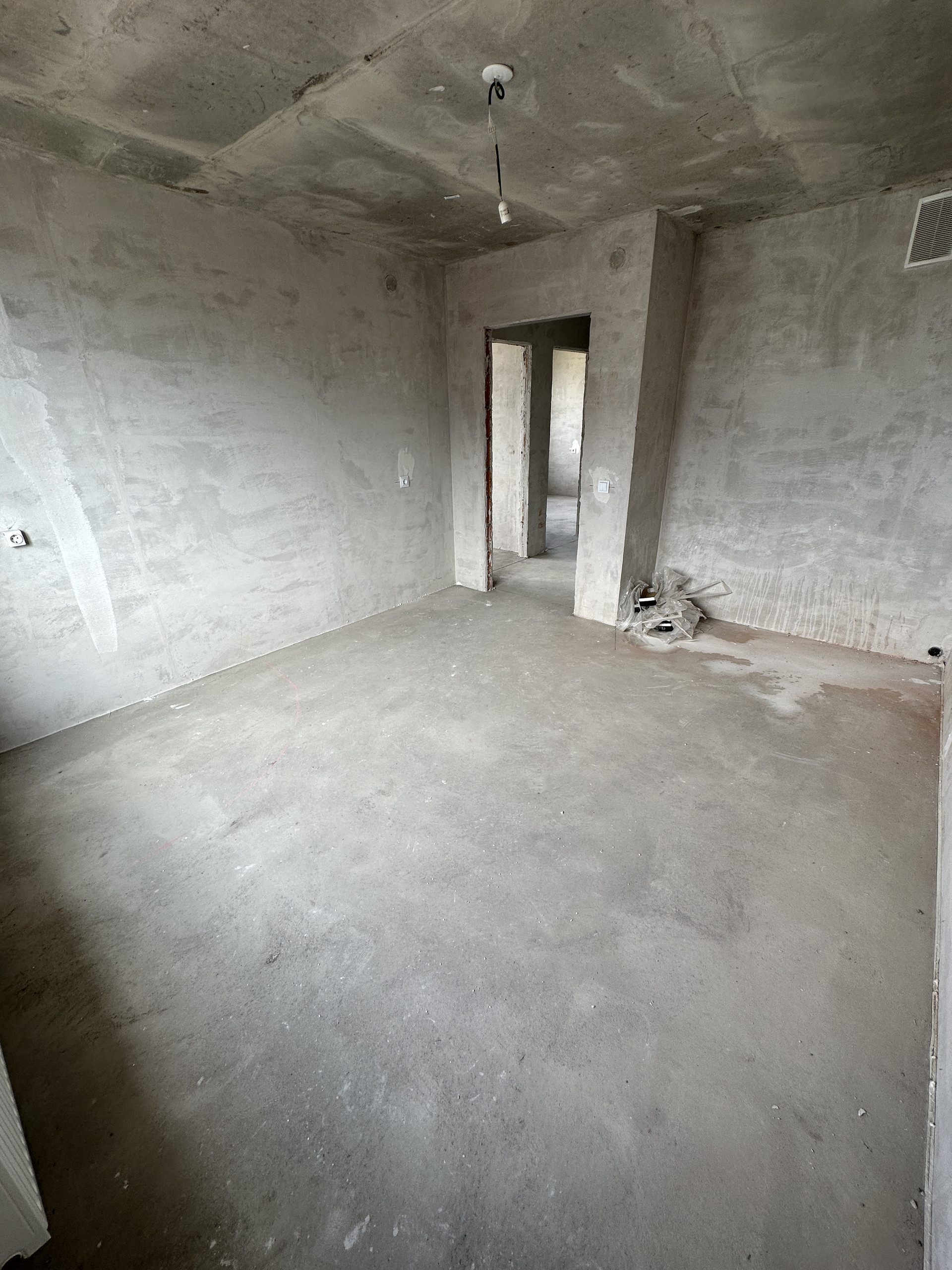 выровненные по маякам стены, гипсовая штукатурка стен в жилых комнатах, цементная – в санузлах, стяжка пола, потолки-плиты перекрытия, электроразводка, лучевая разводка отопления под стяжкой пола с установкой радиаторов, ПВХ-стеклопакеты.