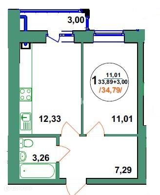 ● лоджия с выходом из кухни — 3 кв.м,