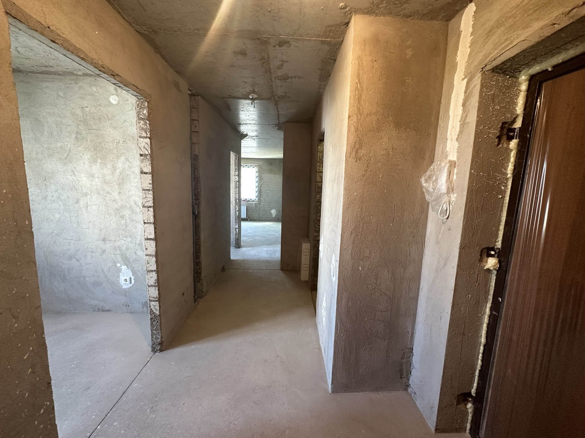 Имеется лоджия из зала, в коридоре можно разместить гардеробную. Получистовая отделка, выполнена стяжка пола, электрика разведена.