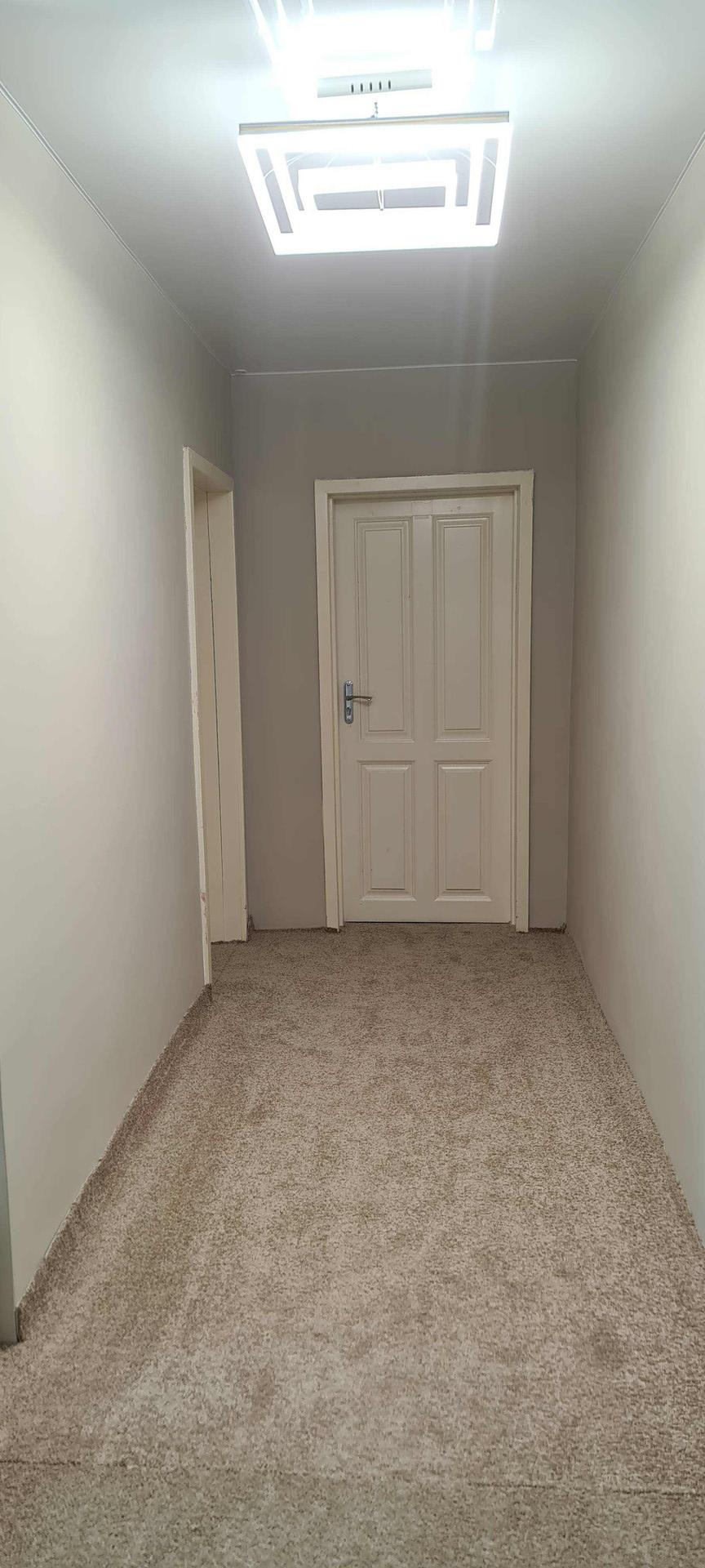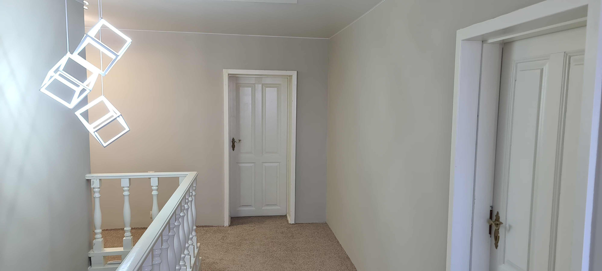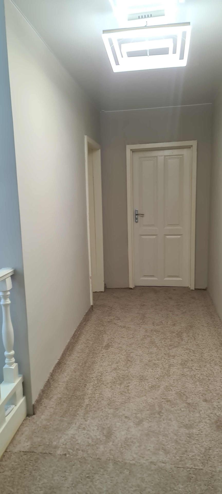 На 2 этаже ковролин везде кроме ванны комнаты, там уложен керамогранит. Все выполнено в светлых тонах.
