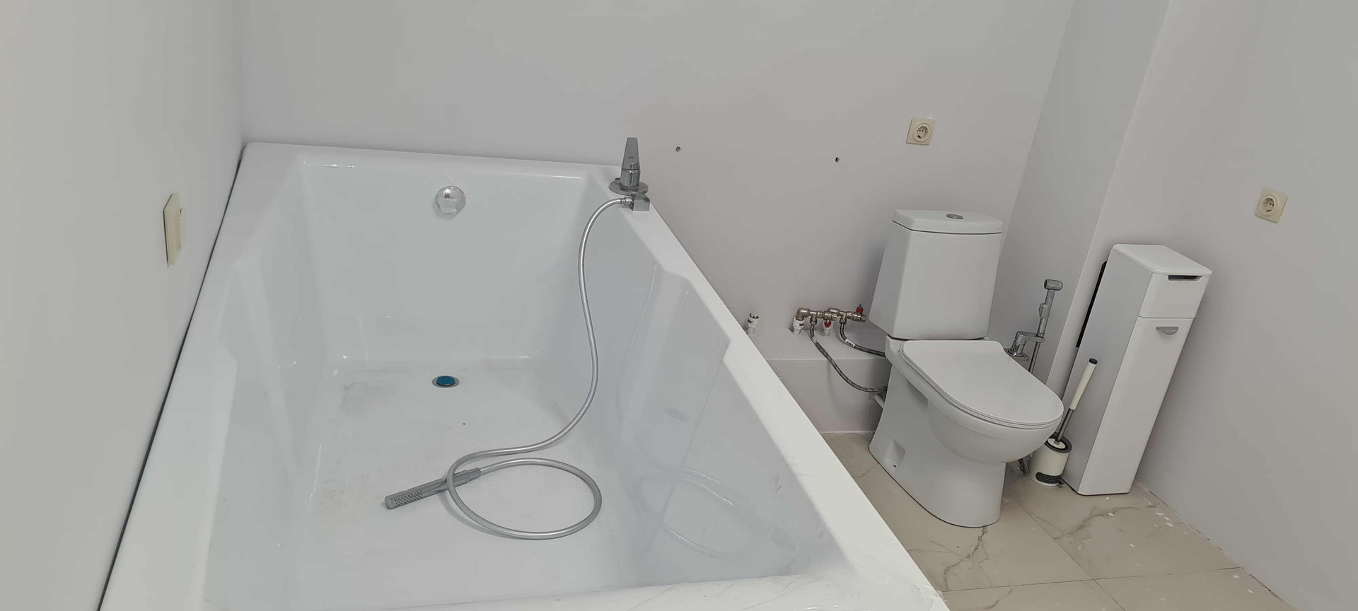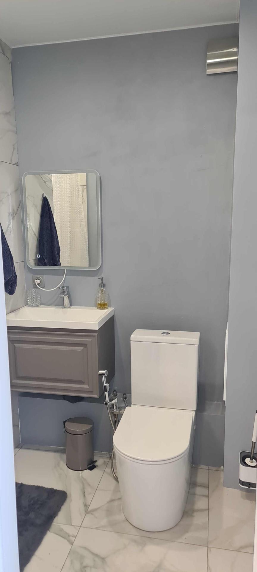 Ванная комната оборудована широкой ванной (1 м), мебель и туалет с гигиениеничским душом. Комнату около туалета можно использовать под гардеробную либо устроить кабинет.