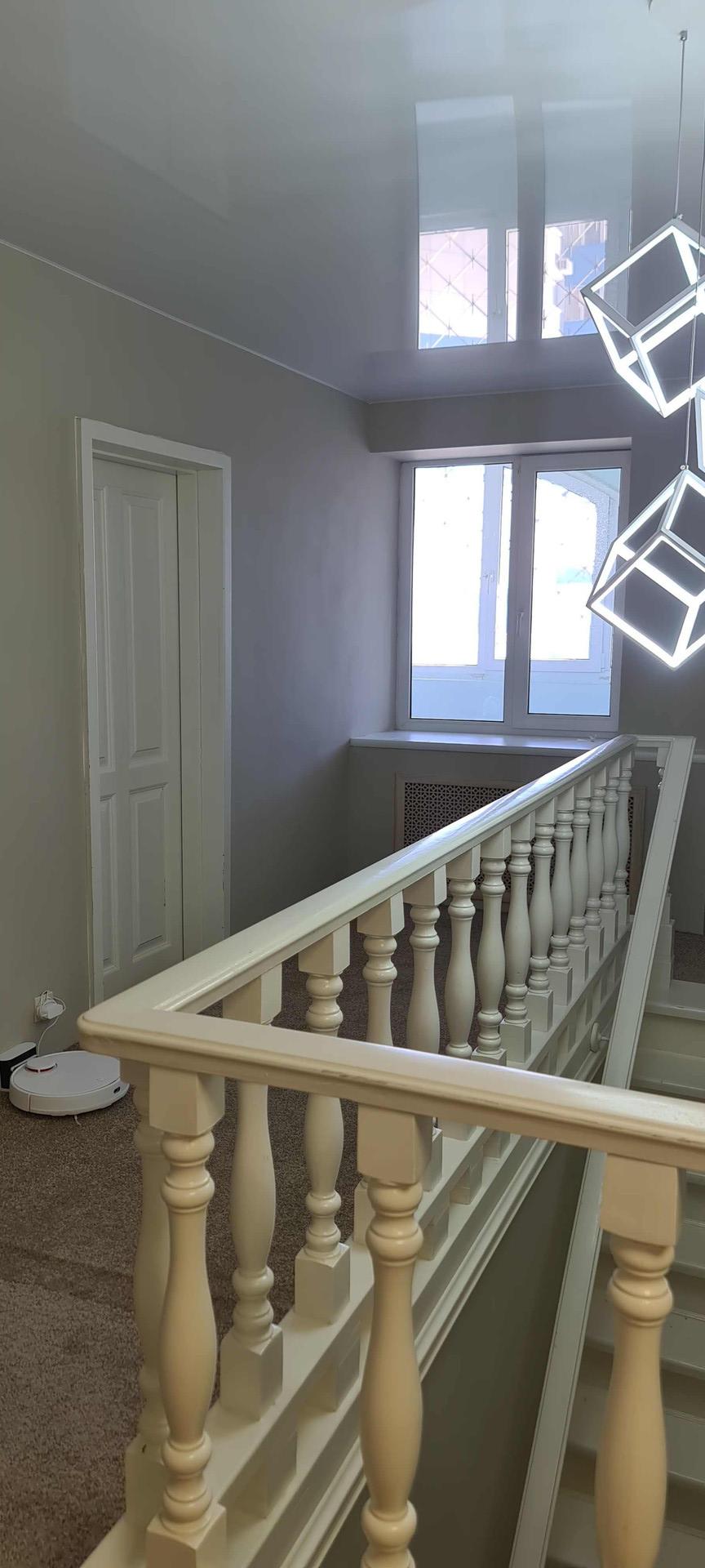На полу первого этажа уложен керамогранит, стены окрашены матовой краской, натяжные глянцевые потолки, освещение на пульте управления.
