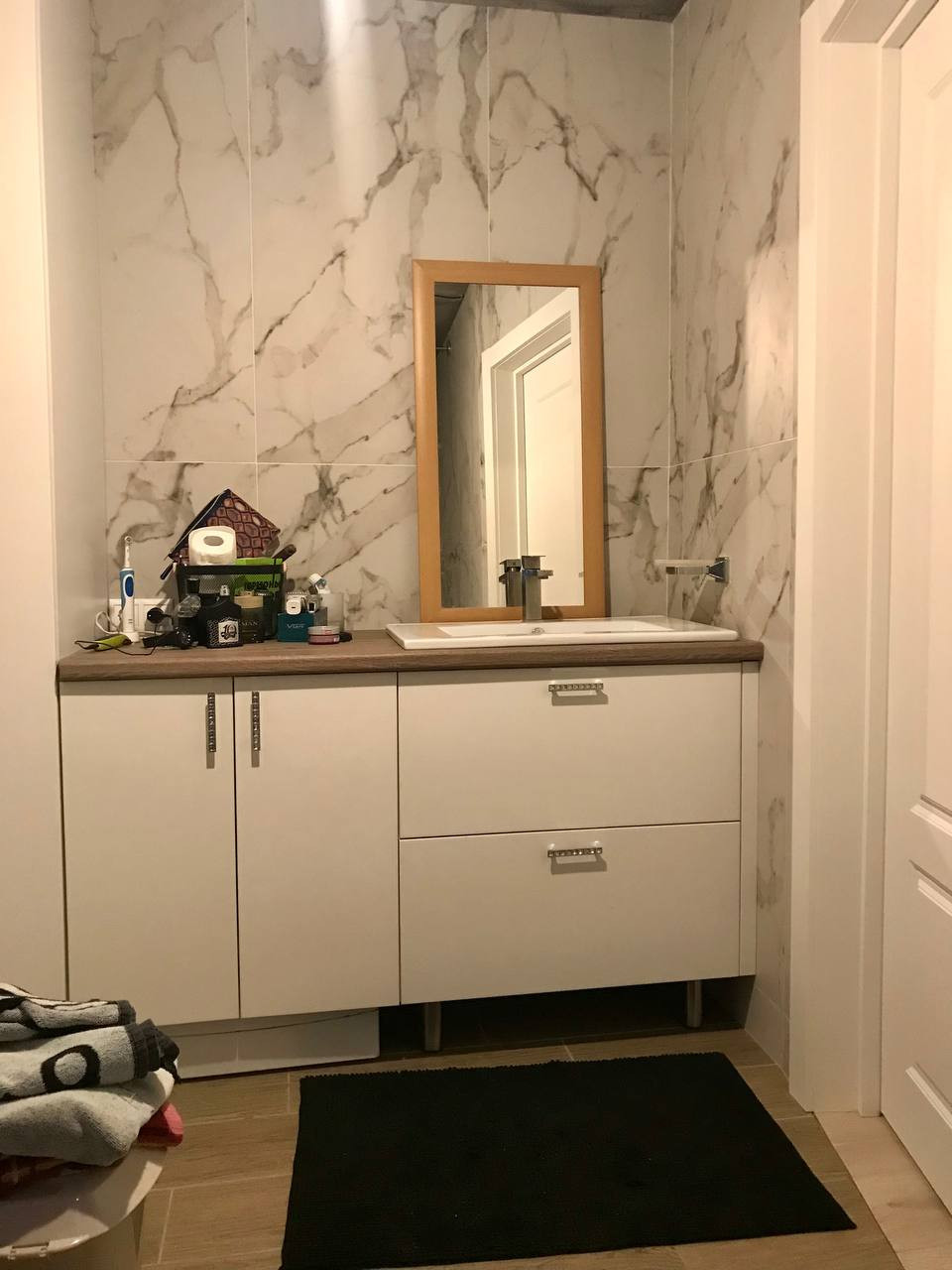 В ванной комнате поверхность натуральный керамогранит цвет мрамор, гарнитур качественный в одном стиле.