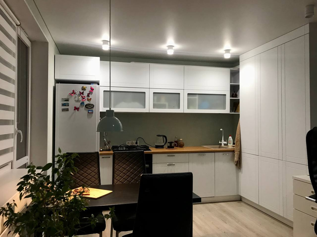 Белый матовый натяжной потолок с потолочными светильниками.