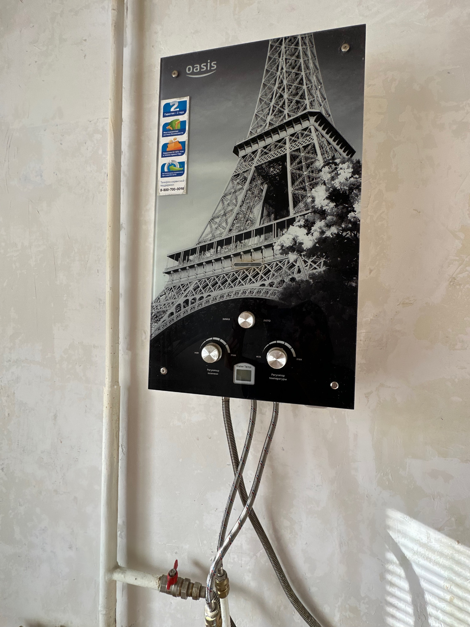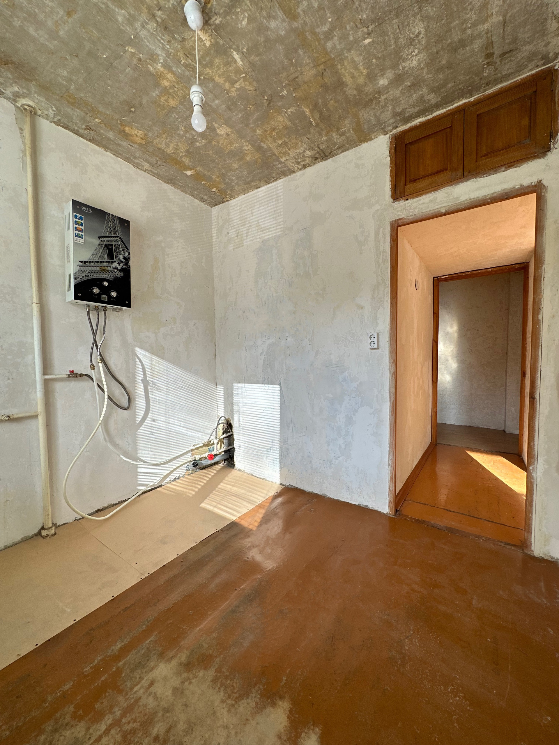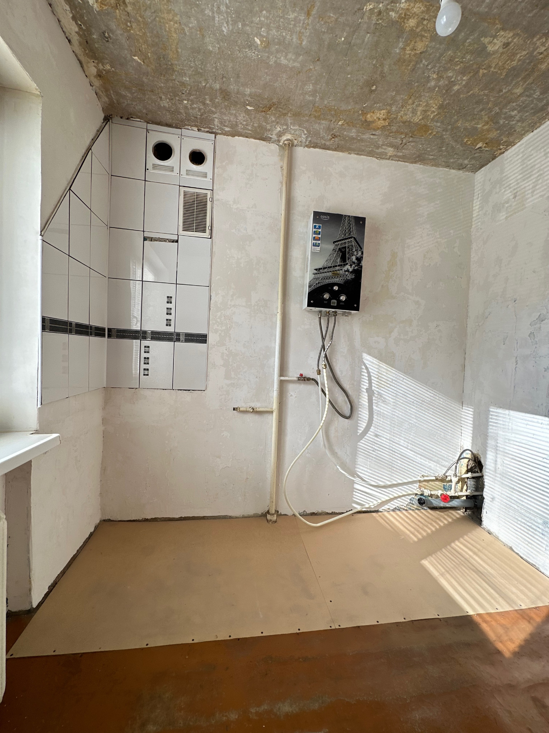 на Кухне (6.3 м3) расположена газовая колонка для нагрева воды, есть фартук из плитки и вентканал для установки вытяжки, все трубы выведены в зону мойки;