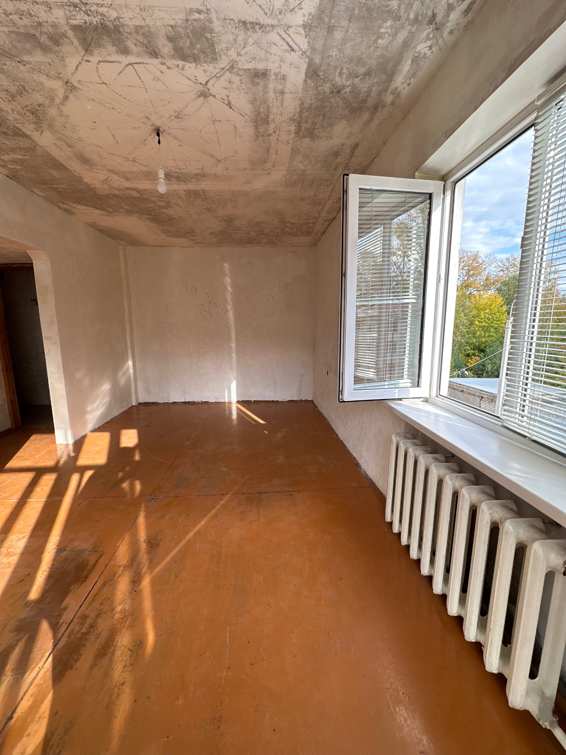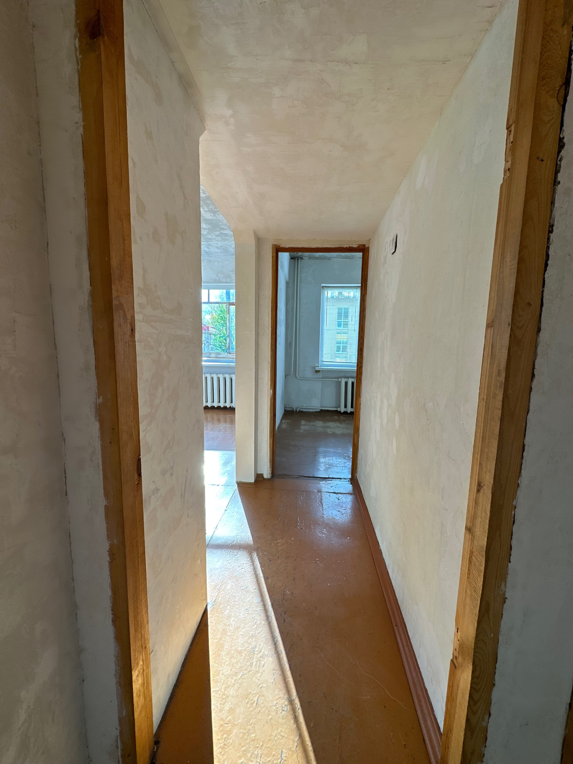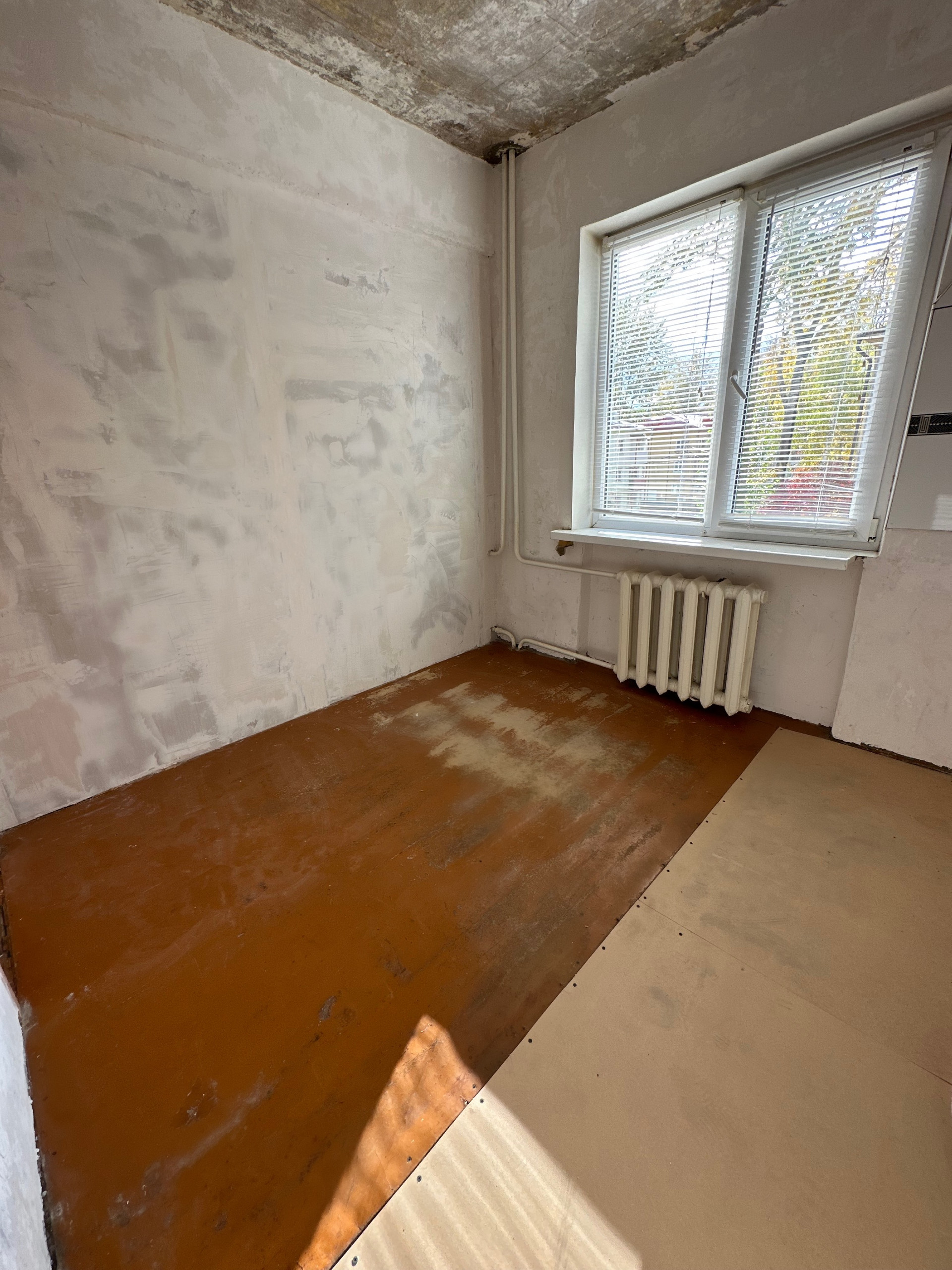 В квартире убраны все старые покрытия, пол подготовлен под линолеум или ламинат, стены зашпаклеваны под обои, потолок очищен до бетона, ванная комната также подготовлена под плитку.
