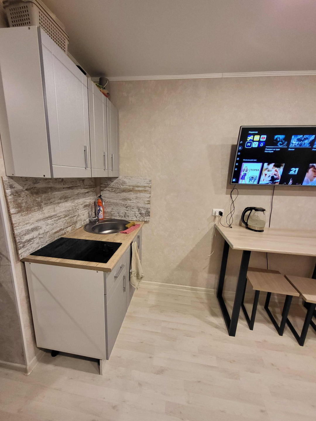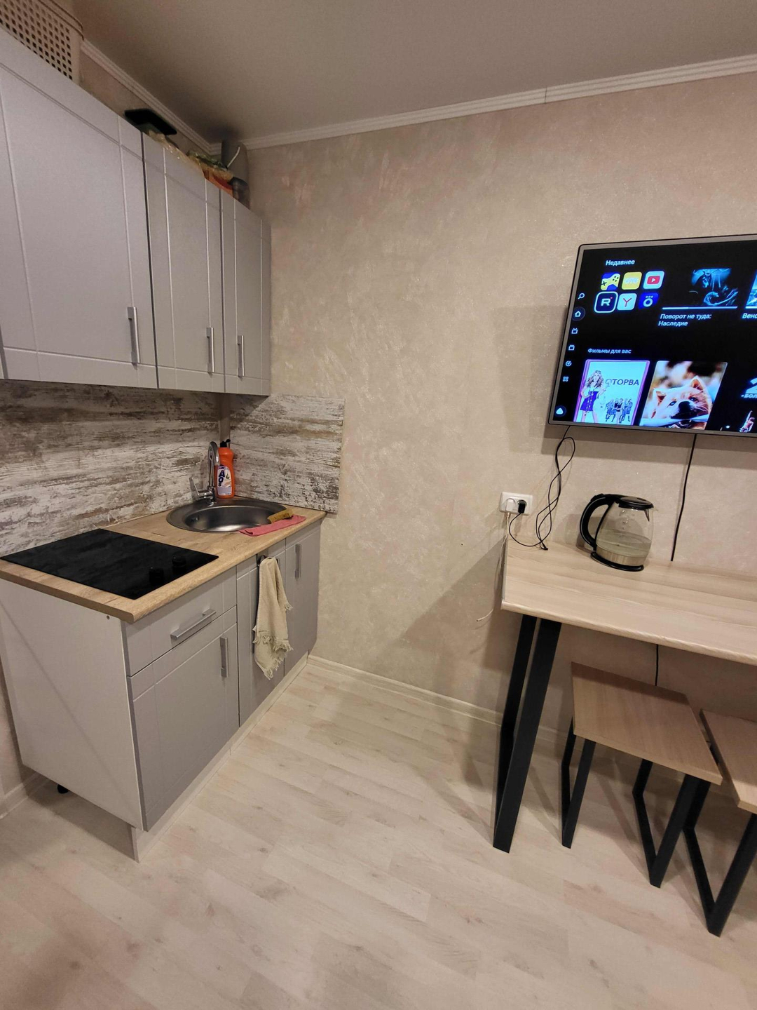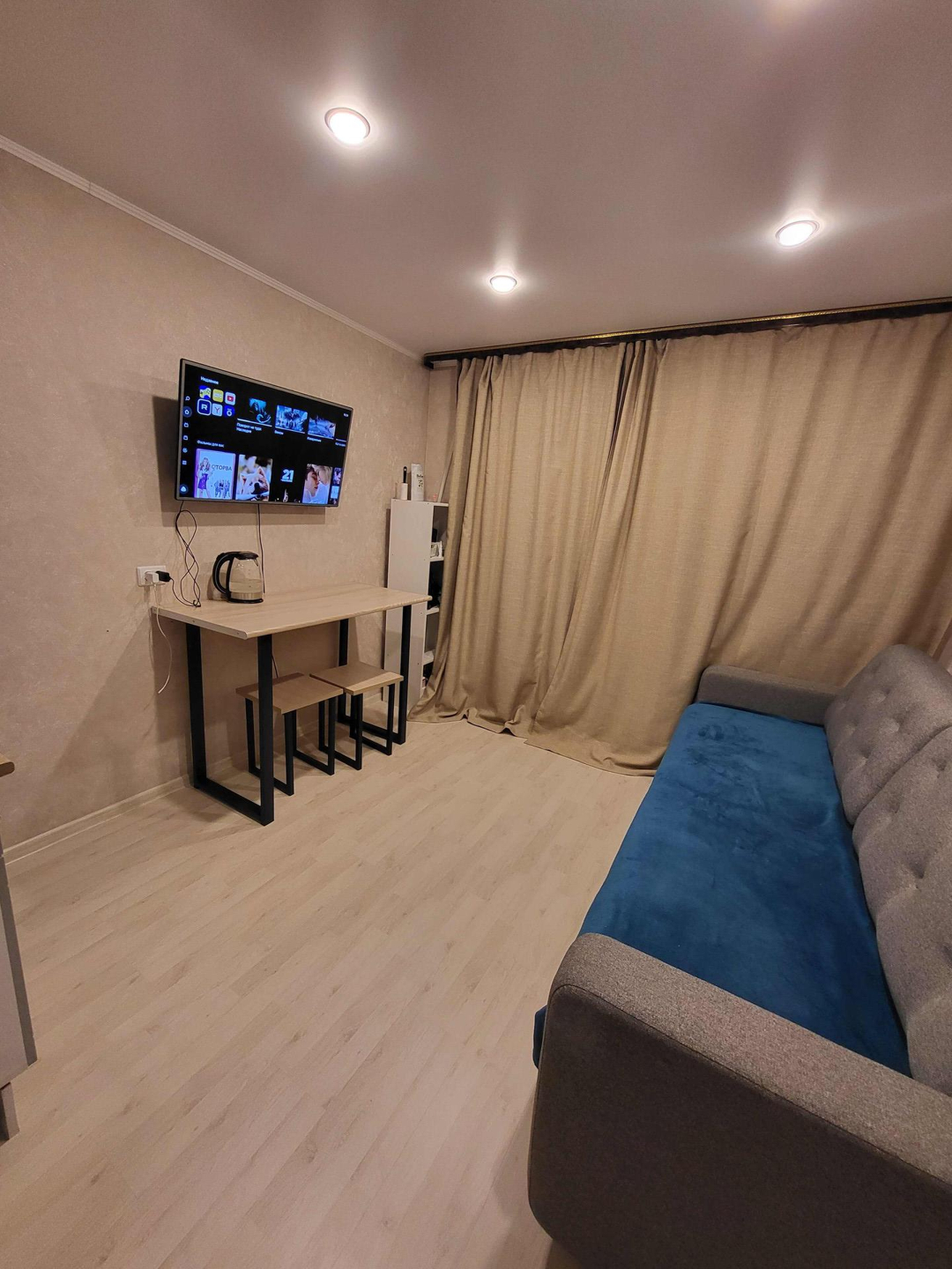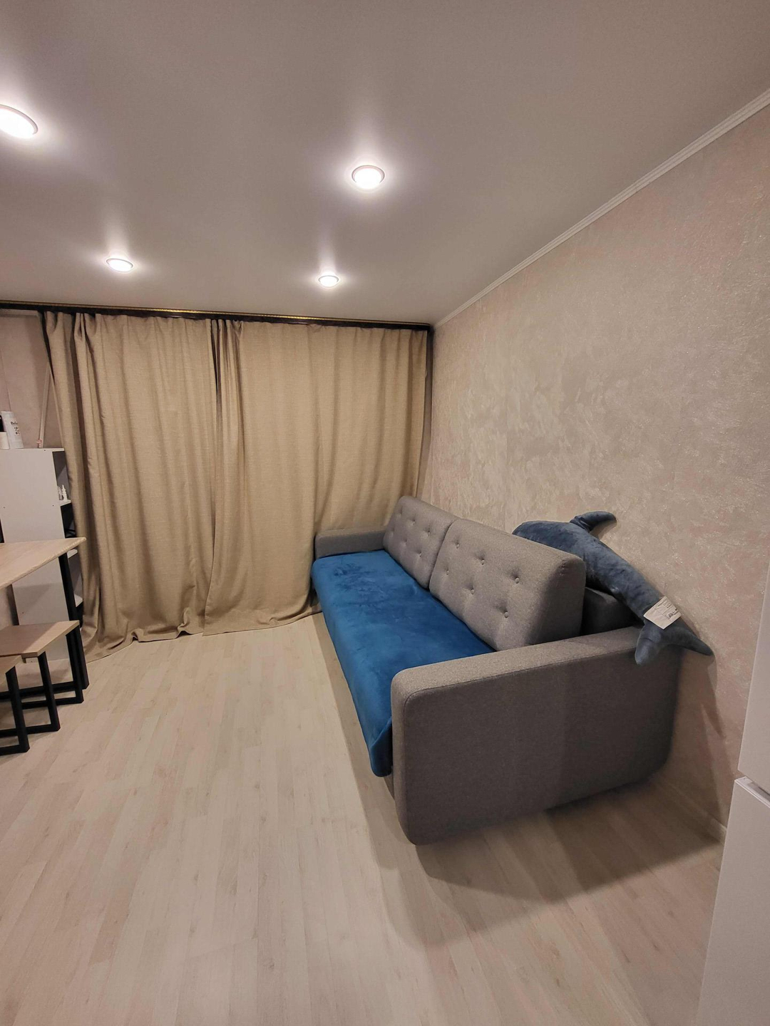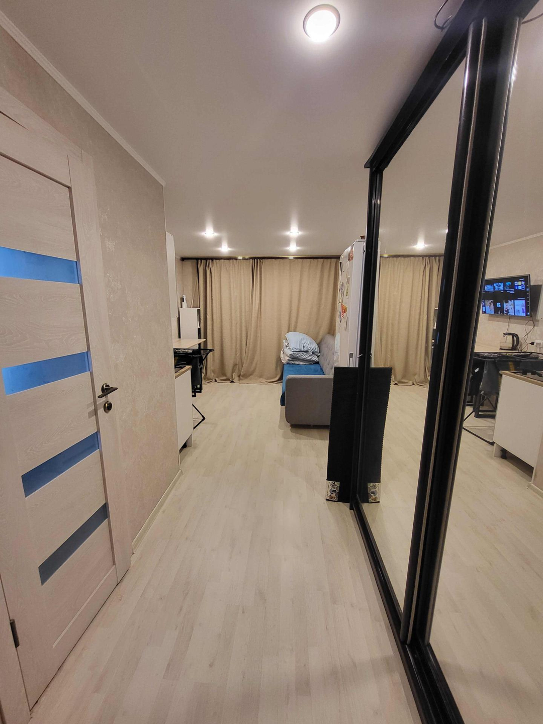 Продается квартира-студия. Один собственник, все документы готовы. Долгов нет. В квартире остаётся кухонный гарнитур, вся сантехника(новая), большой шкаф-купе, обеденный стол и стулья. Вся мебель и сантехника новая, на полу ламинат, натяжные потолки. Квартира очень теплая и уютная. Также установлена новая входная дверь.  Пластиковое окно выходит во двор. Во дворе новая детская площадка и сквер. Рядом остановка. Квартира находится в ипотеке у Сбербанка, никаких долгов по ней нет, свободная продажа.