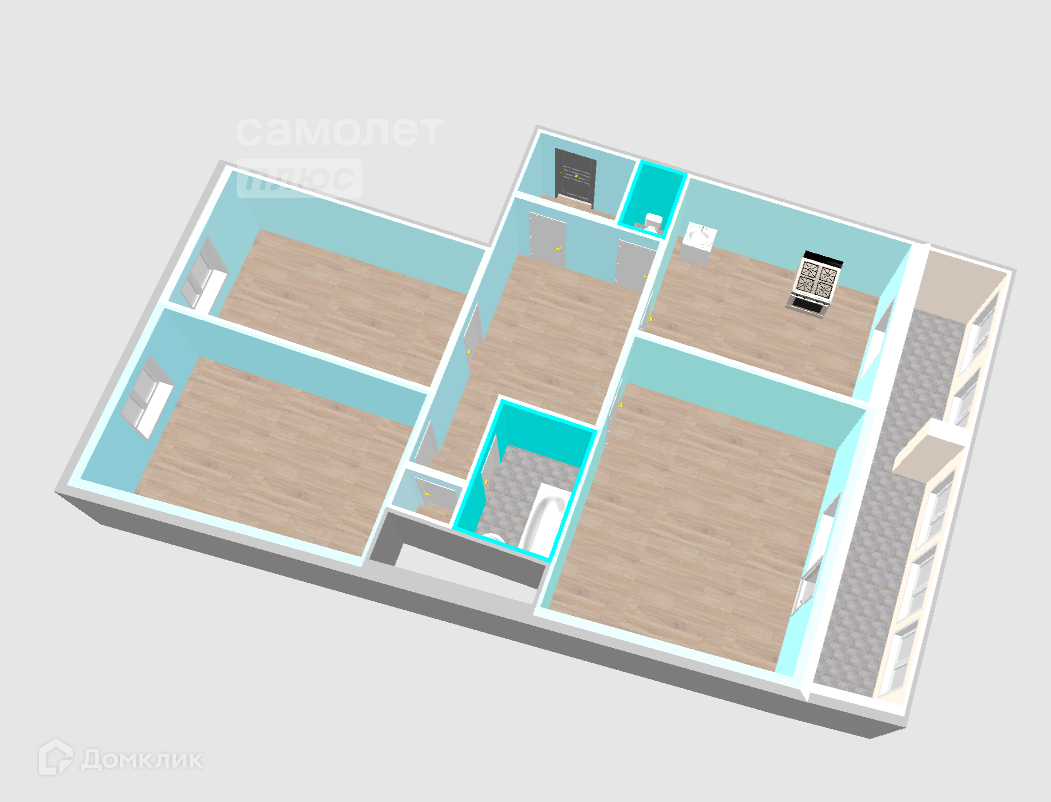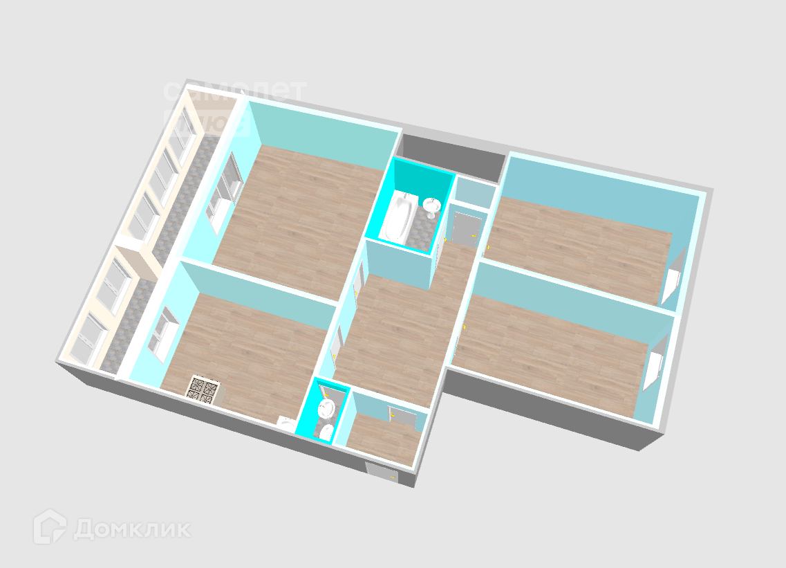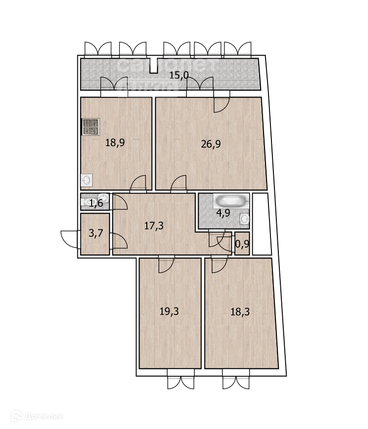 - 3 комнаты 26.9 м2, 19,3 м2, 18,3 м2