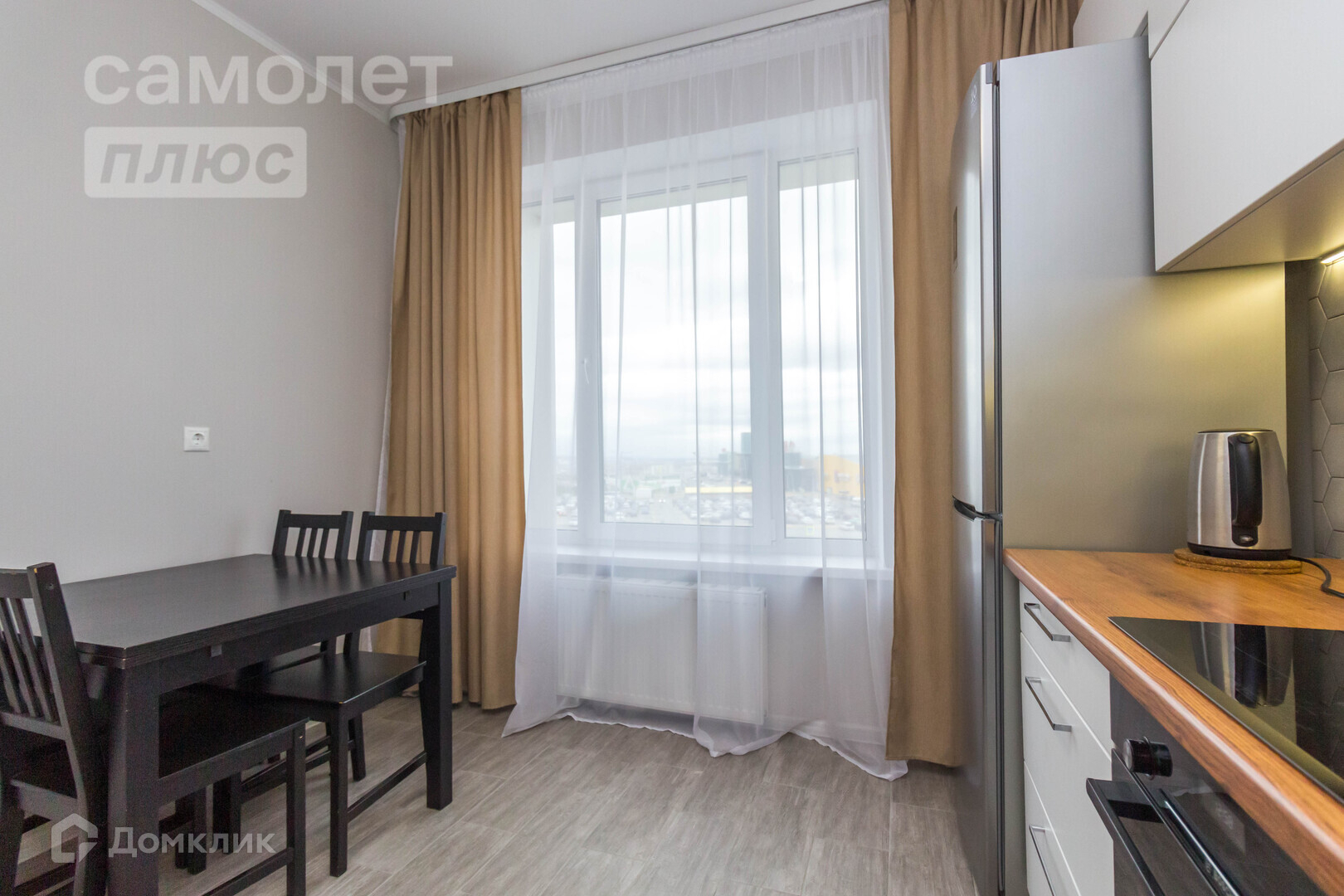 Расширенный оконный проем позволяет проникать дневному свету и солнечным лучам, а в вечернее время любоваться ночными огнями города .