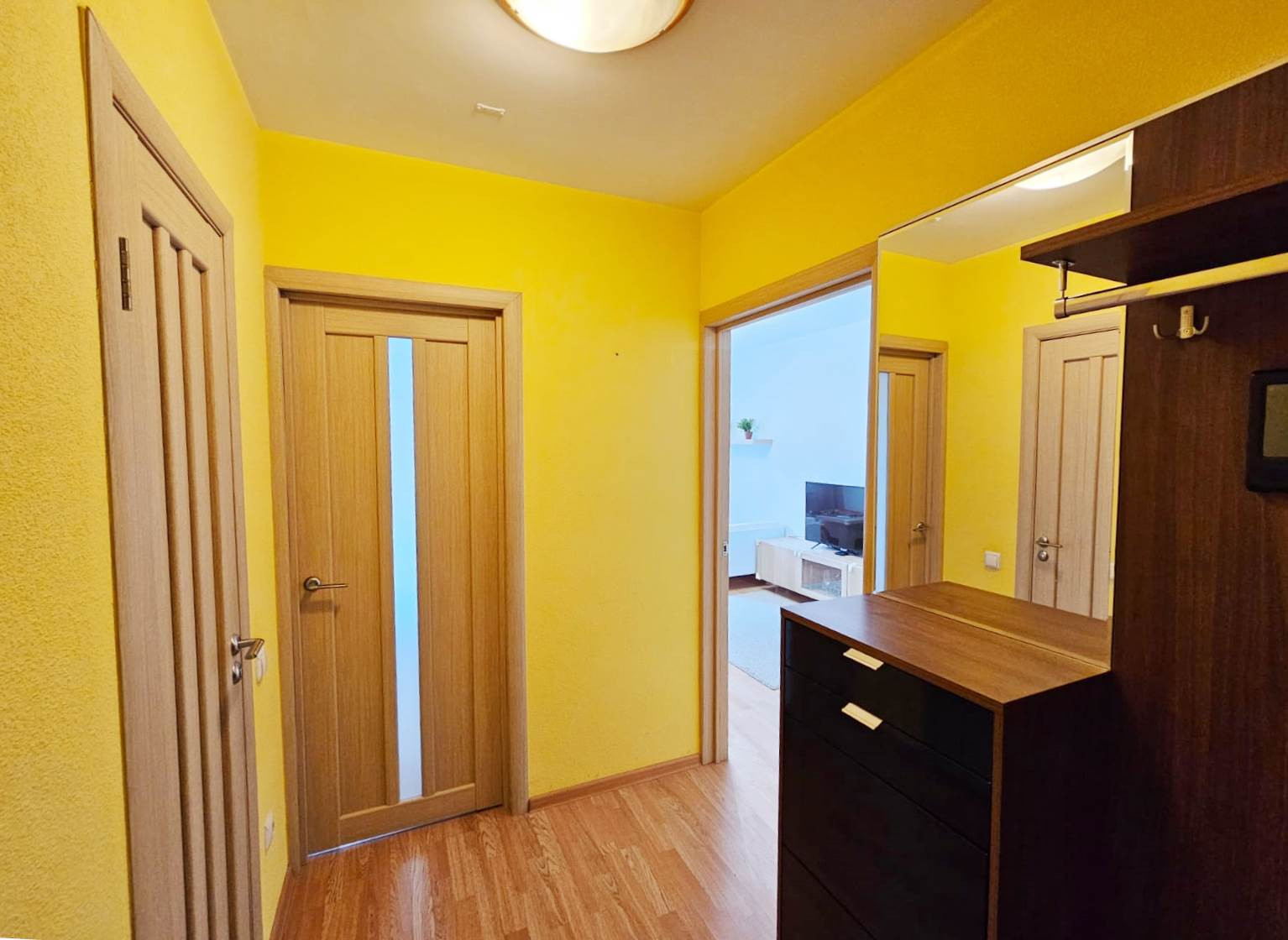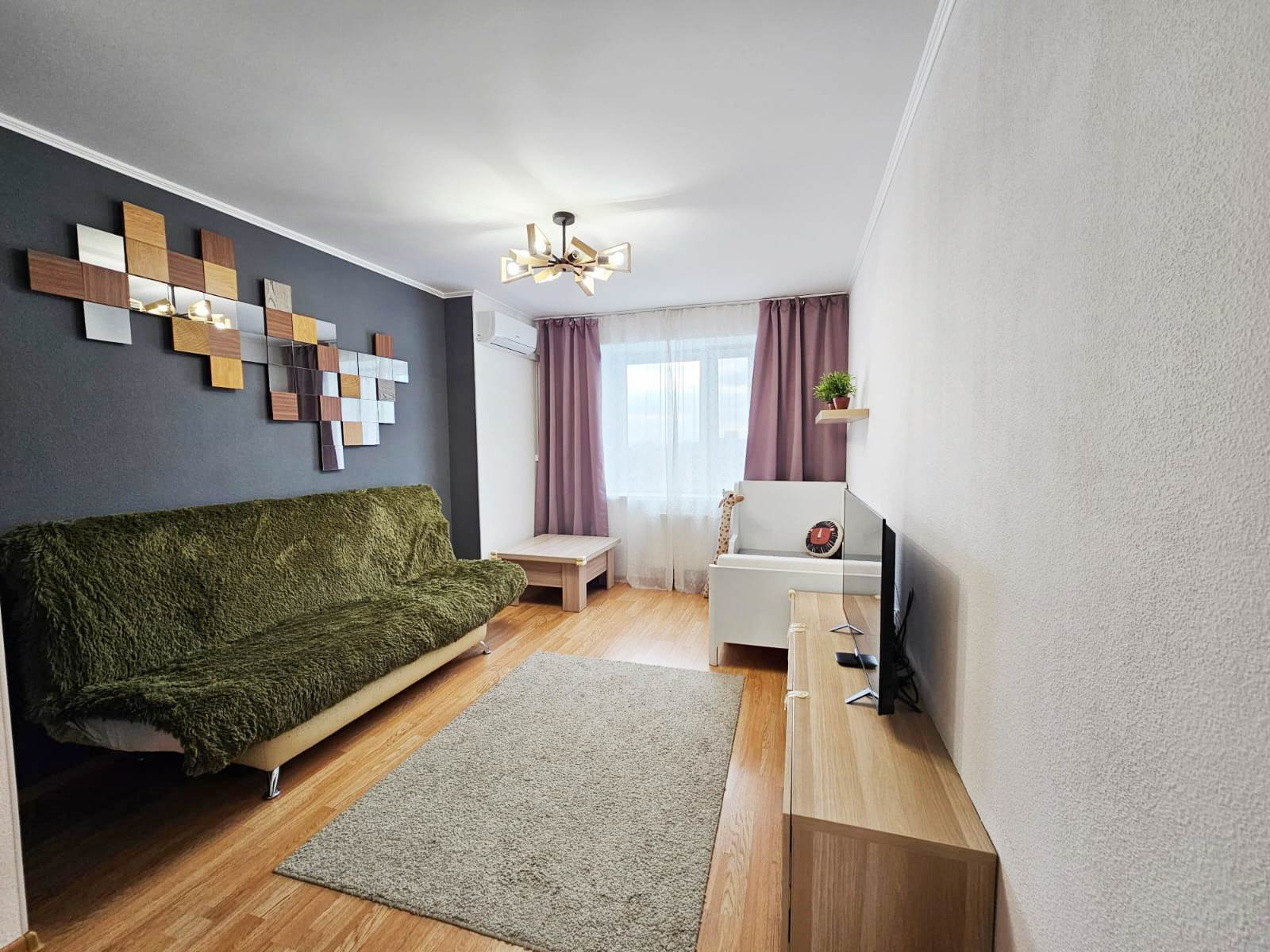 Квартира светлая, из окон открывается панорамный вид на город. В квартире выполнен качественный ремонт из современных материалов. На кухне остается встроенный кухонный гарнитур, укомплектованный варочной панелью, духовым шкафом, вытяжкой. В комнате установлен кондиционер, оборудована вместительная гардеробная, установлен видеодомофон, сигнализация.