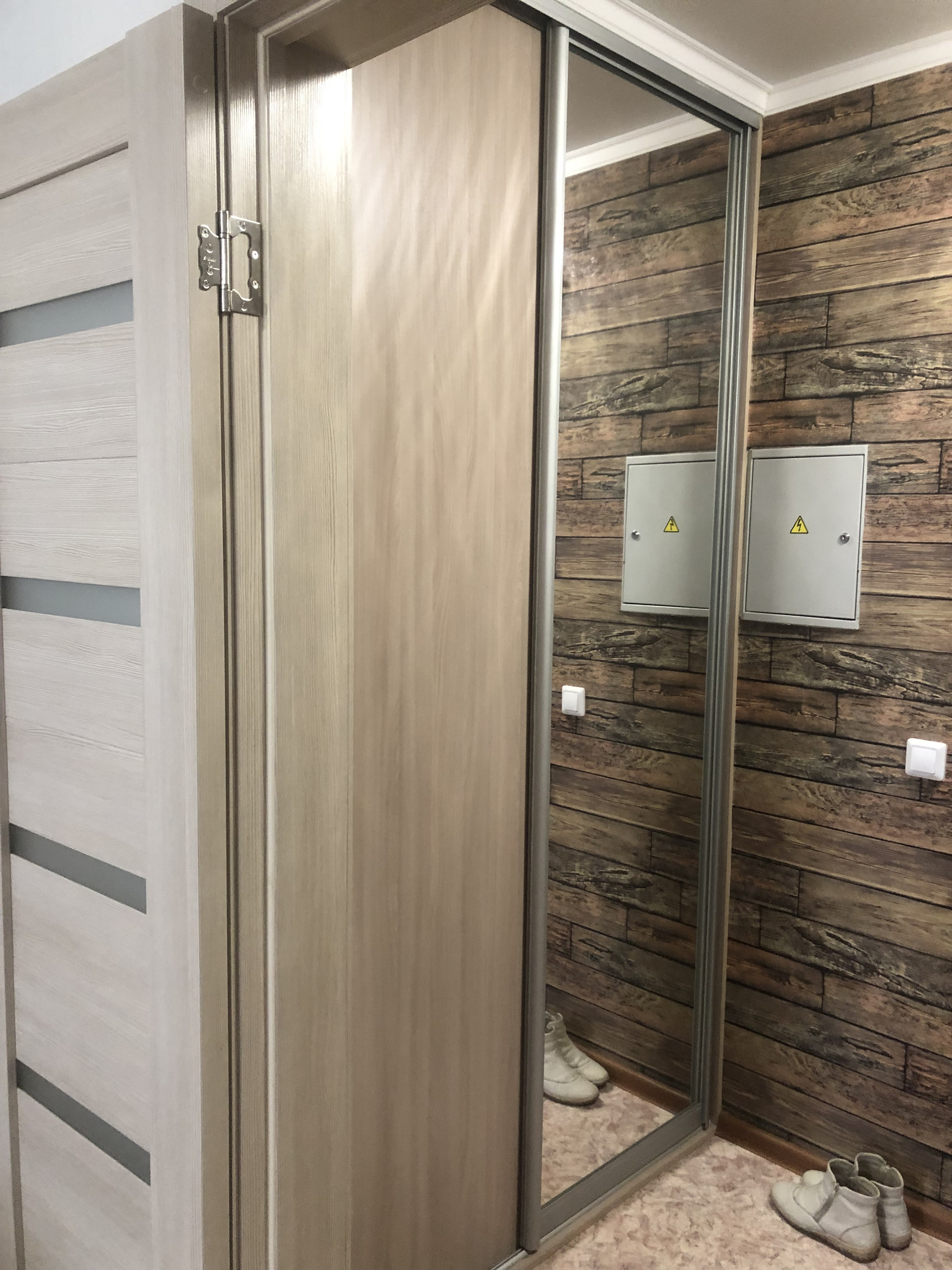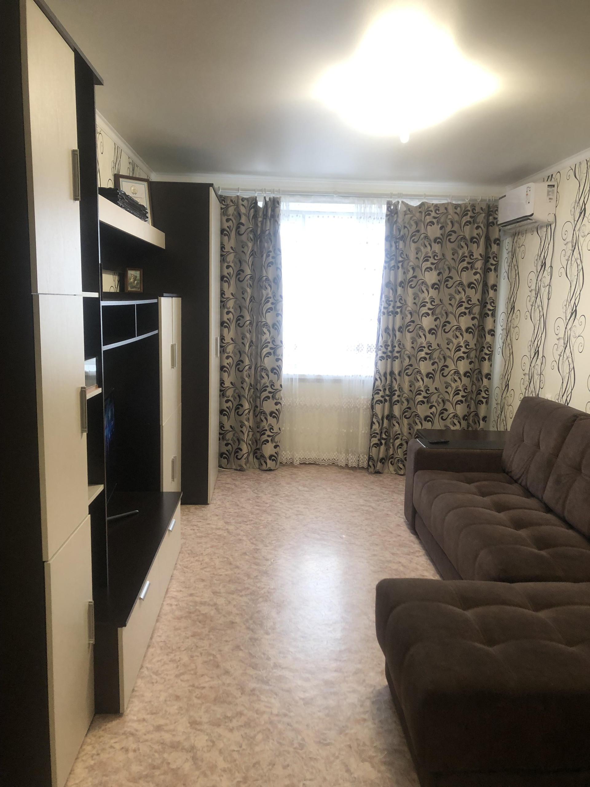 Остается кухонный гарнитур со встроенной бытовой техникой. Шкаф-купе в прихожей. Стенка в комнате. Удобная планировка.