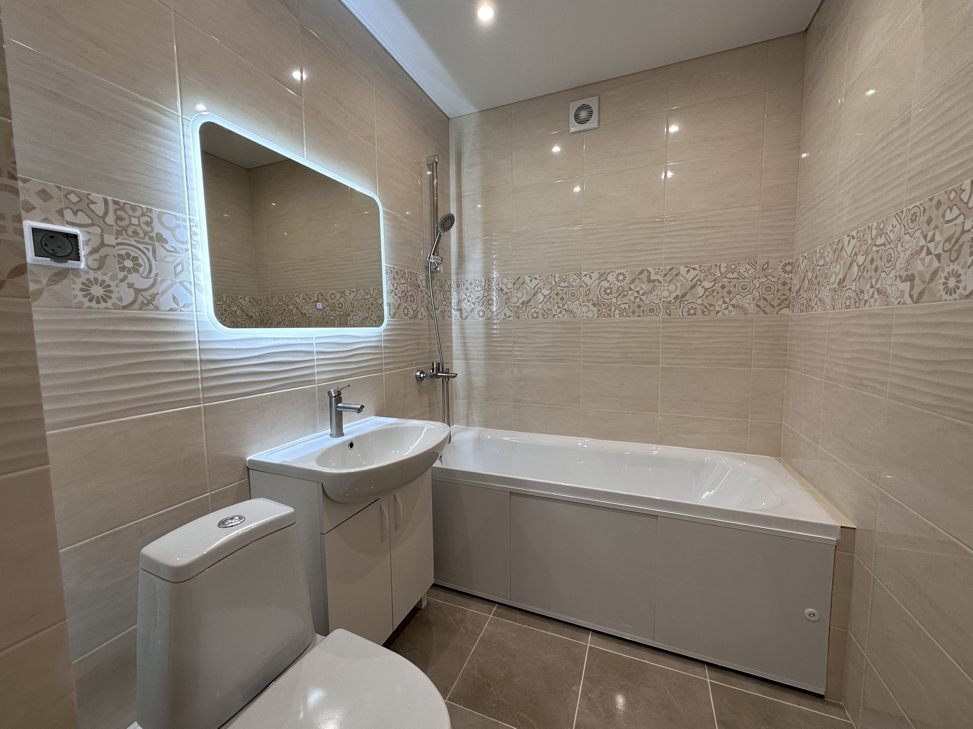 В ванной дорогая плитка и сантехника;