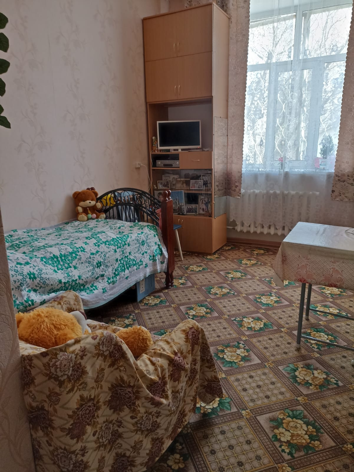 Сделан косметический ремонт: на полу тёплый линолиум, на стенах обои, натяжной потолок, качественная металлическая дверь, электрика в комнате новая, уникальность комнаты высокий потолок 3.2м. Зимой тепло (студия не угловая, отопление работает как надо), летом прохладно. Окно пластиковое, выходит прямо на Непейцевский дендропарк.