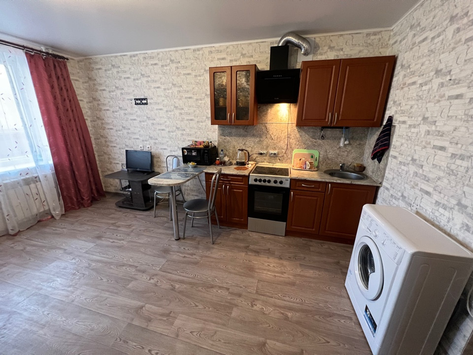 Квартира продается с мебелью (кухонный гарнитур, шкаф, диван, прихожая) и техникой (стиральная машинка, холодильник, вытяжка).