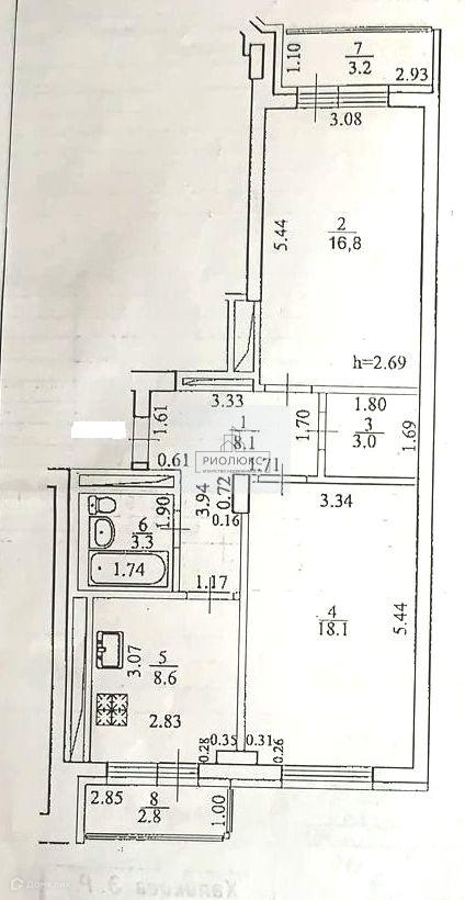 Площадь – 60,9 м², комнаты 18,1+16,8 кв.м, кухня 8,6 кв.м