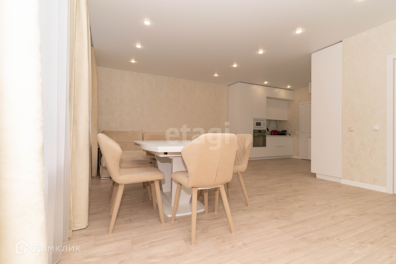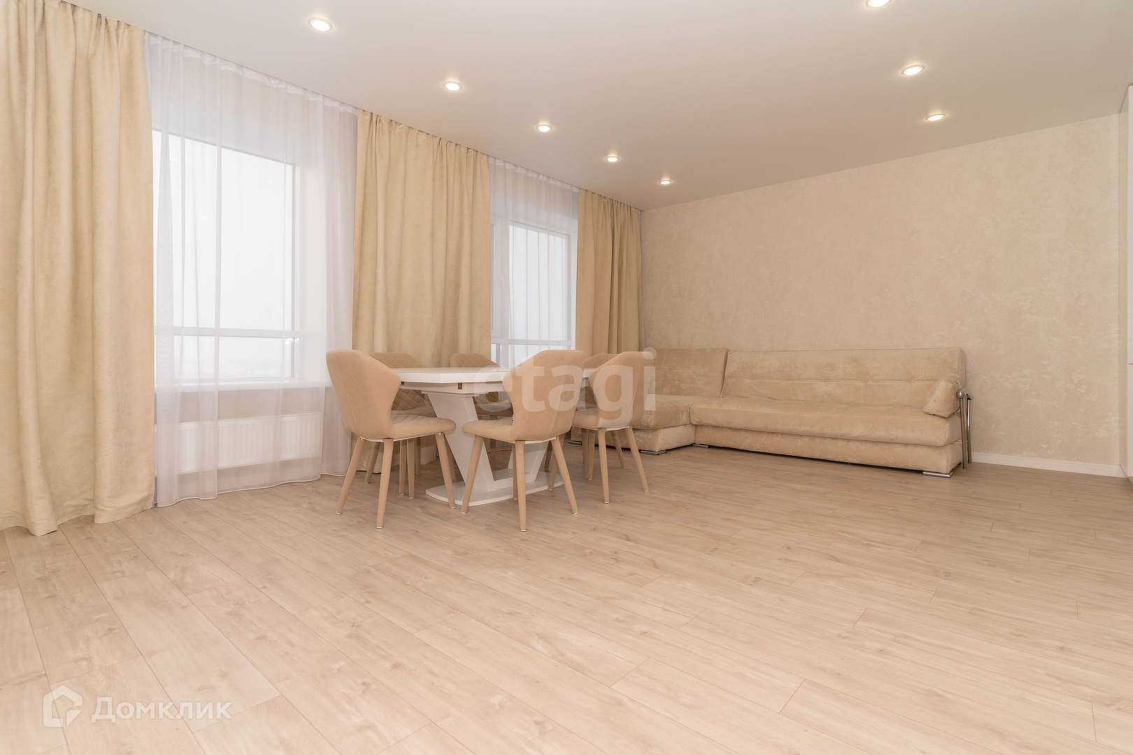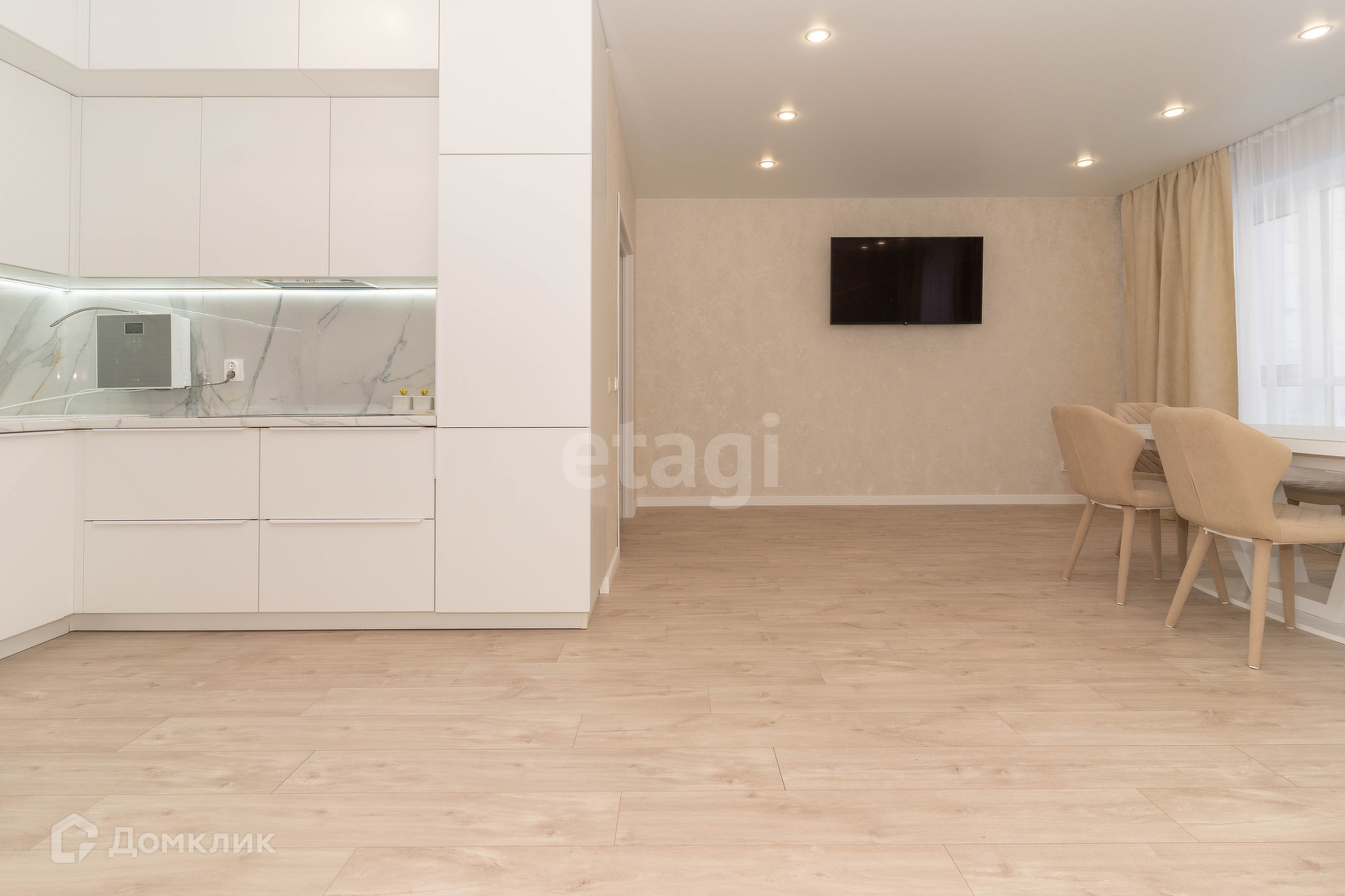 На кухне гостиной, встроенный кухонный гарнитур с двумя холодильниками, посудомоечная машина, варочная поверхность, духовой шкаф, встроенная микроволновая печь, телевизор. Большой и комфортный диван. Обеденная группа стол-трансформер и мягкие стулья.