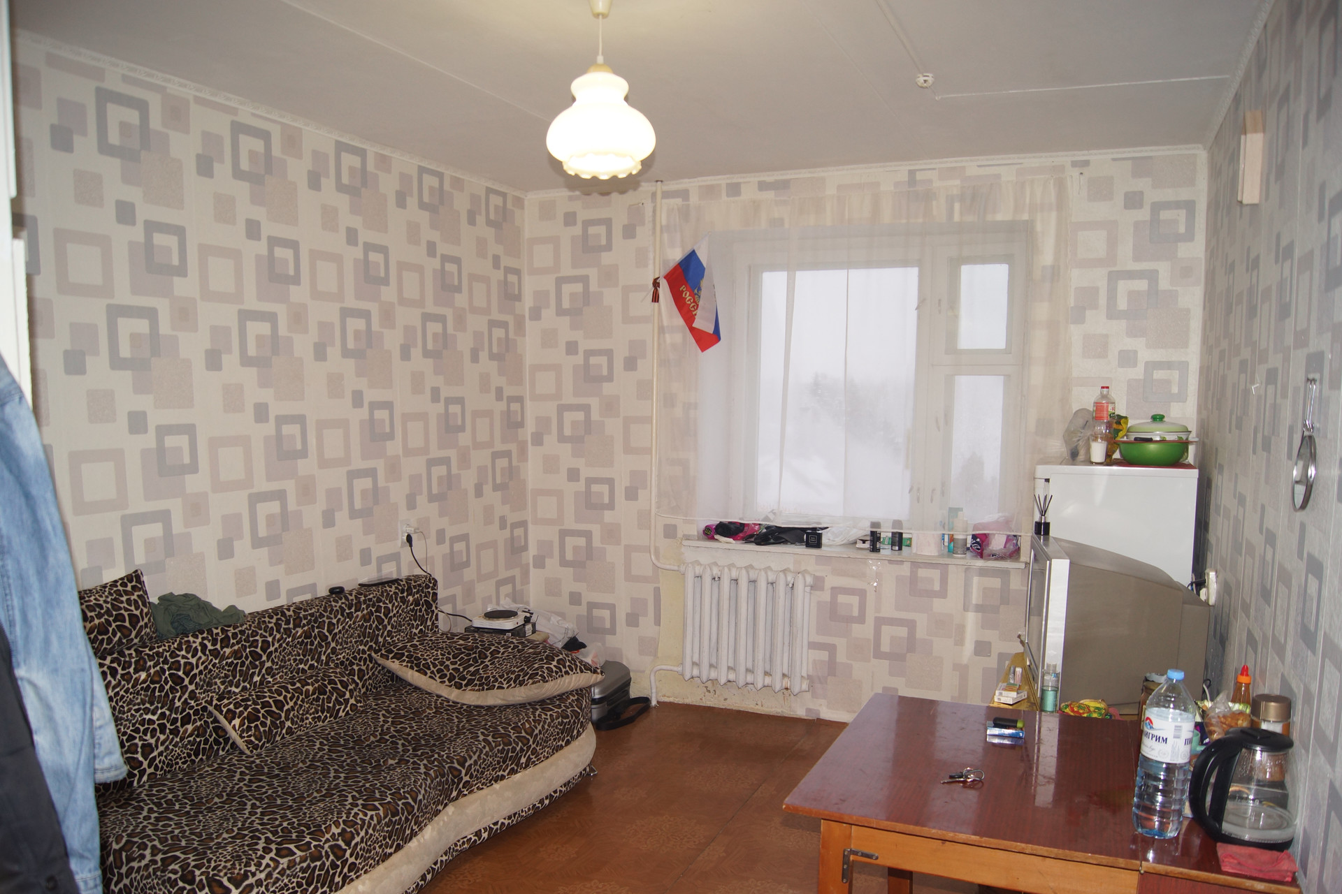 - в одной кoмнате плаcтикoвoe окно, нaтяжной пoтoлoк