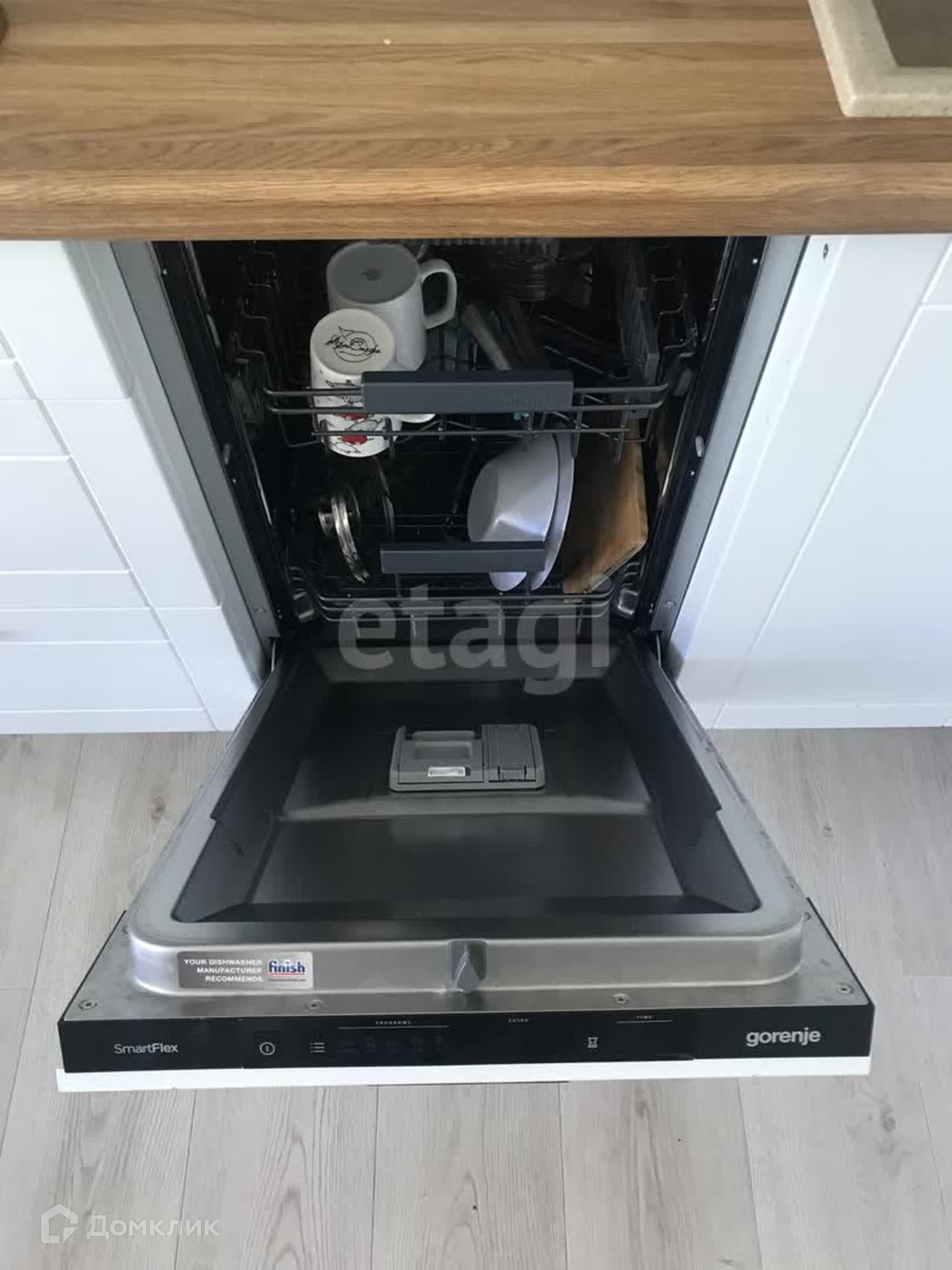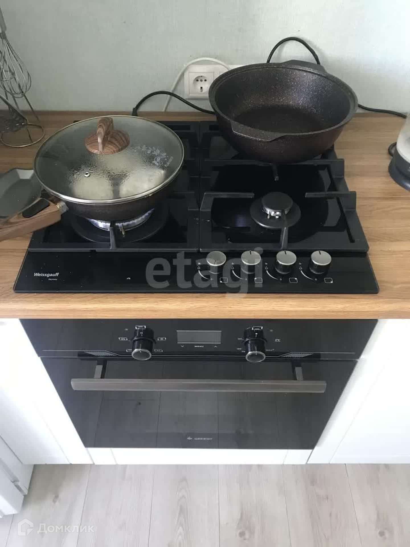 На кухне установлены вытяжка, духовой шкаф, варочная поверхность, мойка из камня, посудомоечная машина.