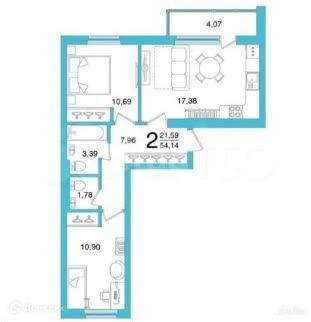 Квартира-распашонка, с большой кухней гостиной и двумя полноценными спальнями.
