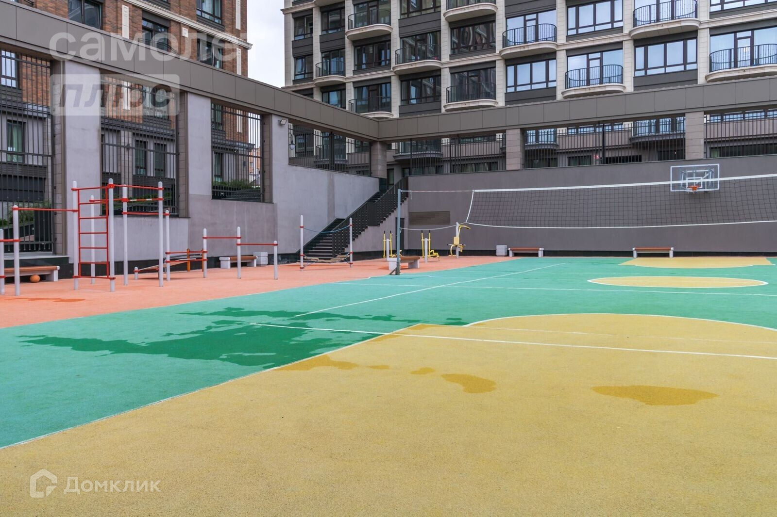 При этом сохранена приватность частных дворов для жителей комплекса - территория зонирована на две больших части, каждая из которых стоит на своем стилобате, на котором расположилось по два жилых корпуса и высоко поднятые внутренние закрытые дворы.