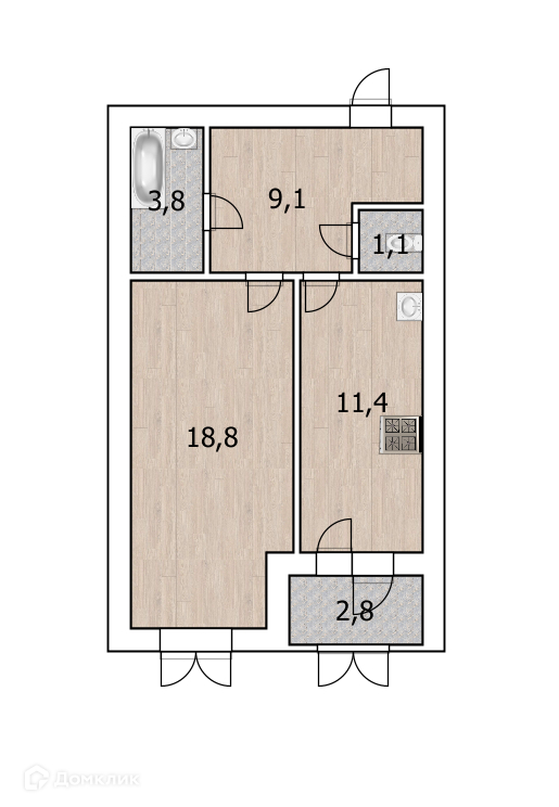 Однокомнатная квартира, расположенная по адресу: ул. Лётчиков, д. 18, 2/8 этажность. Общая площадь 44,2 м2.