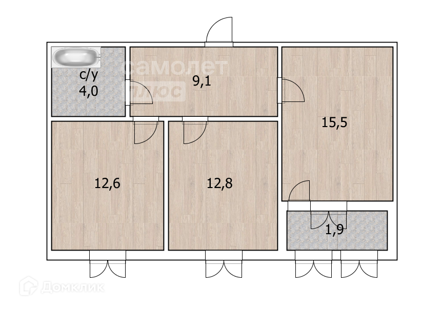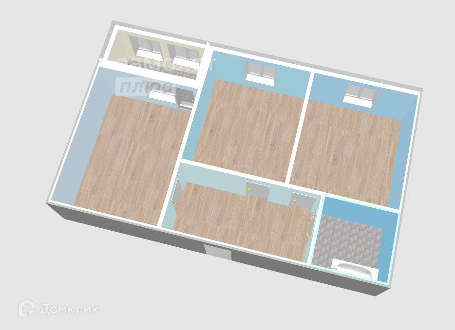 Параметры: Общая площадь - 57.9 кв.м., комнаты - 15.5 и 12.8 кв.м, кухня-гостиная - 12.6 кв. м, прихожая - 9.1 кв.м. с/у -4.0 кв.м. летнее помещение.
