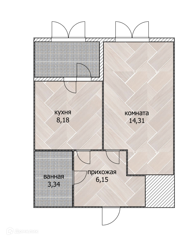 Параметры: Общая площадь - 33,56 кв.м, жилая площадь- 14,31 кв.м.