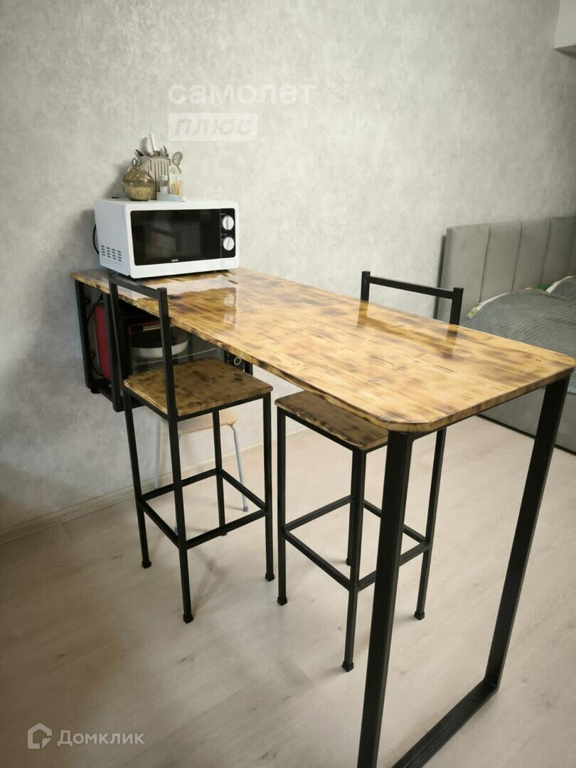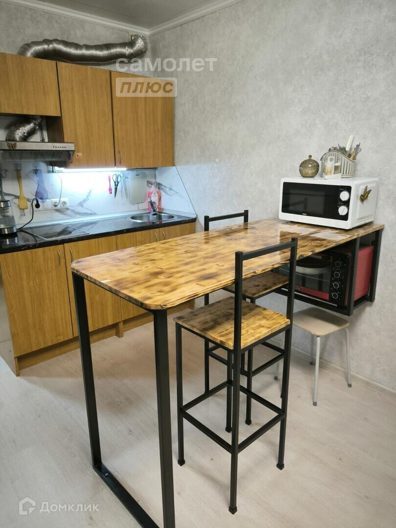 Остается шкаф длина 2,7 м, современная светодиодная люстра, барная стойка, стулья, кухня с вытяжкой, шкафы и зеркало в ванной.