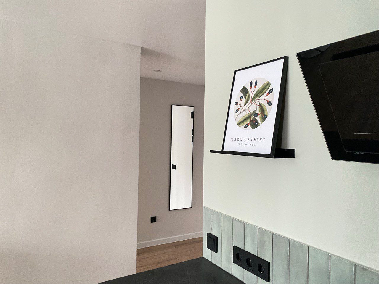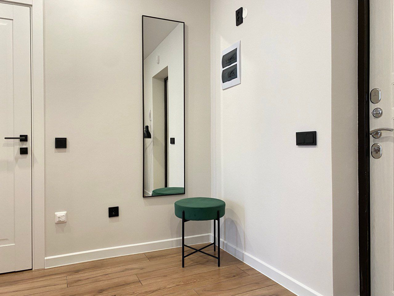 На входе прихожая с большим зеркалом, пуфом и встроенным шкафом, идеально подходящим для размещения верхней одежды и обуви.