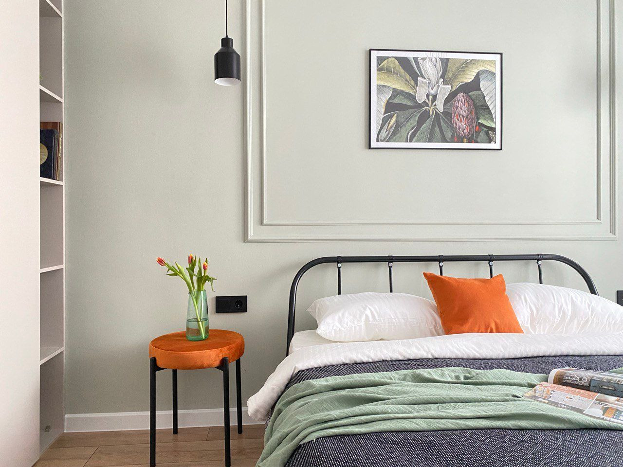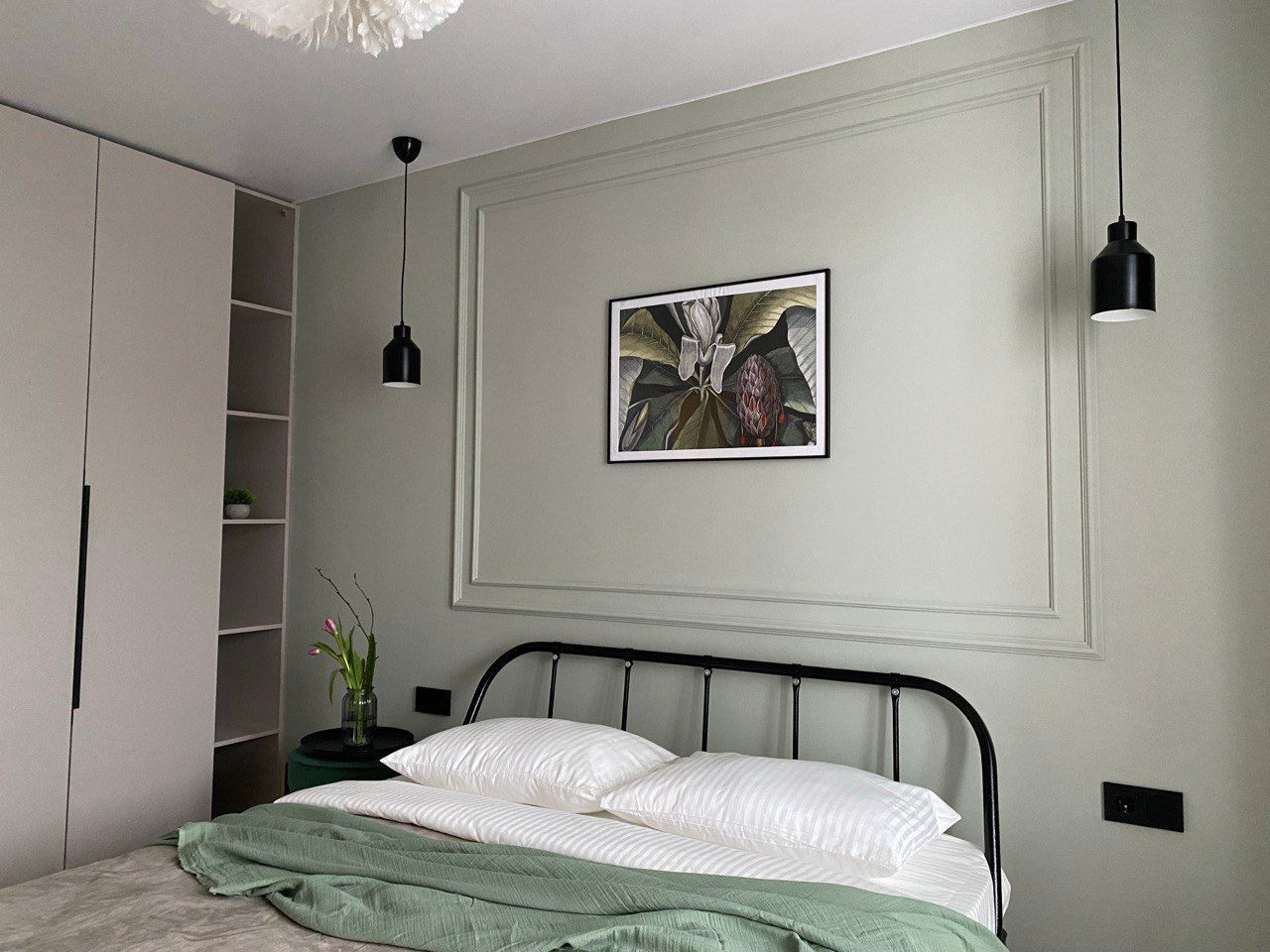 В спальне встроенный шкаф- гардероб для личных вещей и одежды, удобная двухспальная кровать с ортопедическим матрасом Аскона.