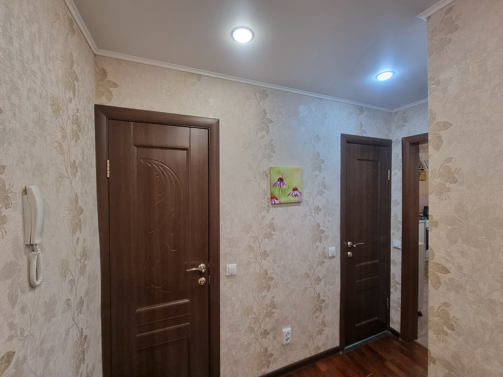 Планировка квартиры общей площадью 47,8 кв.м. (+лоджия 6,4) простая и функциональная: при входе прямоугольная прихожая - коридор, слева от входа раздельные ванная и туалет, далее Большая Кухня, прямо находится первая Комната (или Зал) с выходом на застекленную Лоджию, справа вторая комната (или спальня) Окна выходят во двор на Детсад, на Восточную сторону, в направлении Ахметова.