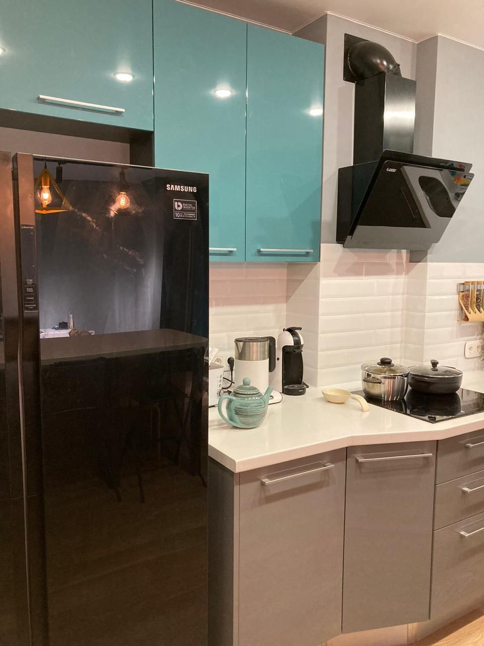 Холодильник Samsung, вытяжка - Exiteq 1000м3/ч, варочная поверхность - Whirlpool, посудомоечная машина, стиральная и сушильная машина, микроволновая печь - Electrolux, духовка - Bosch, Подогреватель посуды - Bertazzoni, ванна и туалет - Roca, душевая система - Bravat, кухня - Mr. Doors, каменная столешница с встроенной раковиной, барная стойка так же, с каменной столешницей.