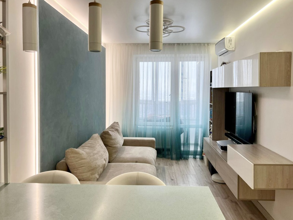 В квартире сделан новый дизайнерский ремонт: потолки гипсокартон с подсветкой, линейное освещение по стенам, декоративные перегородки и настенные панели, керамогранит, ламинат, панорамное остекление гостиной и на лоджии. В квартире остается кухонный гарнитур с техников и часть мебели.