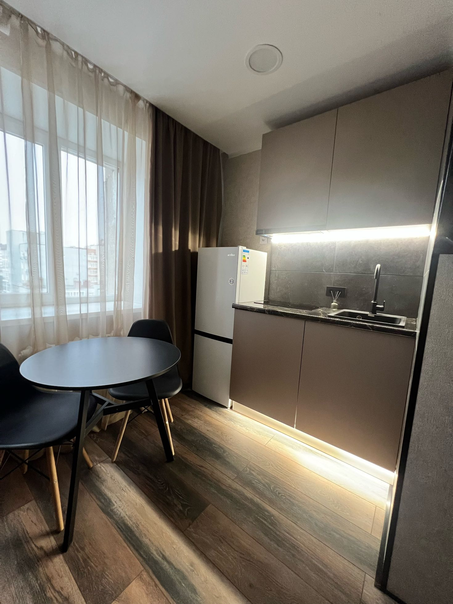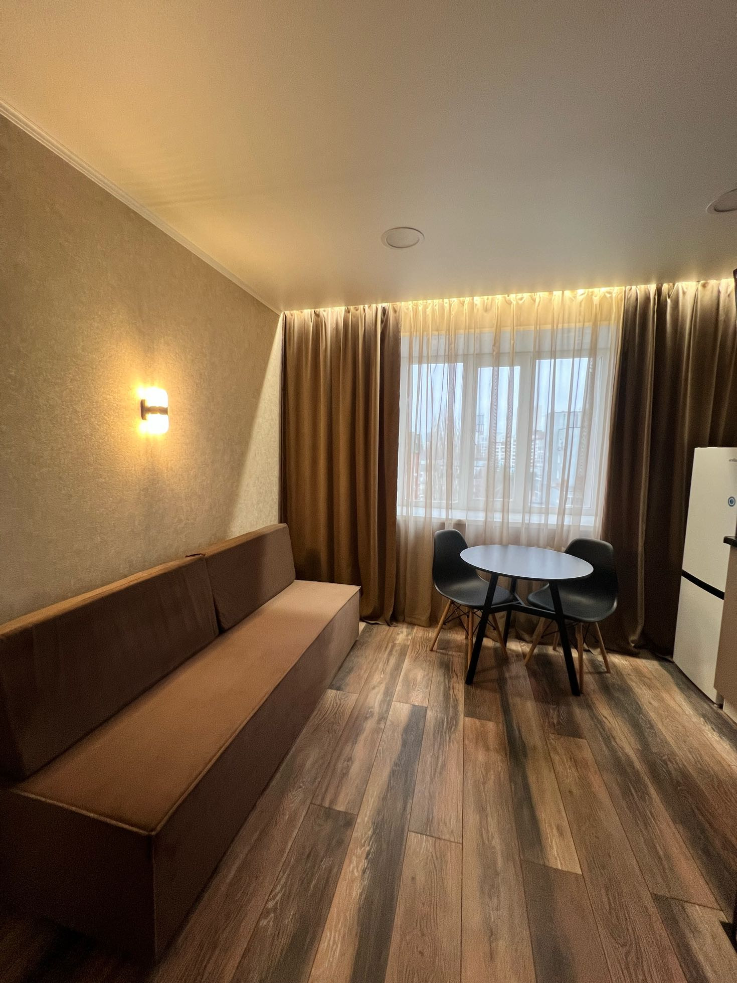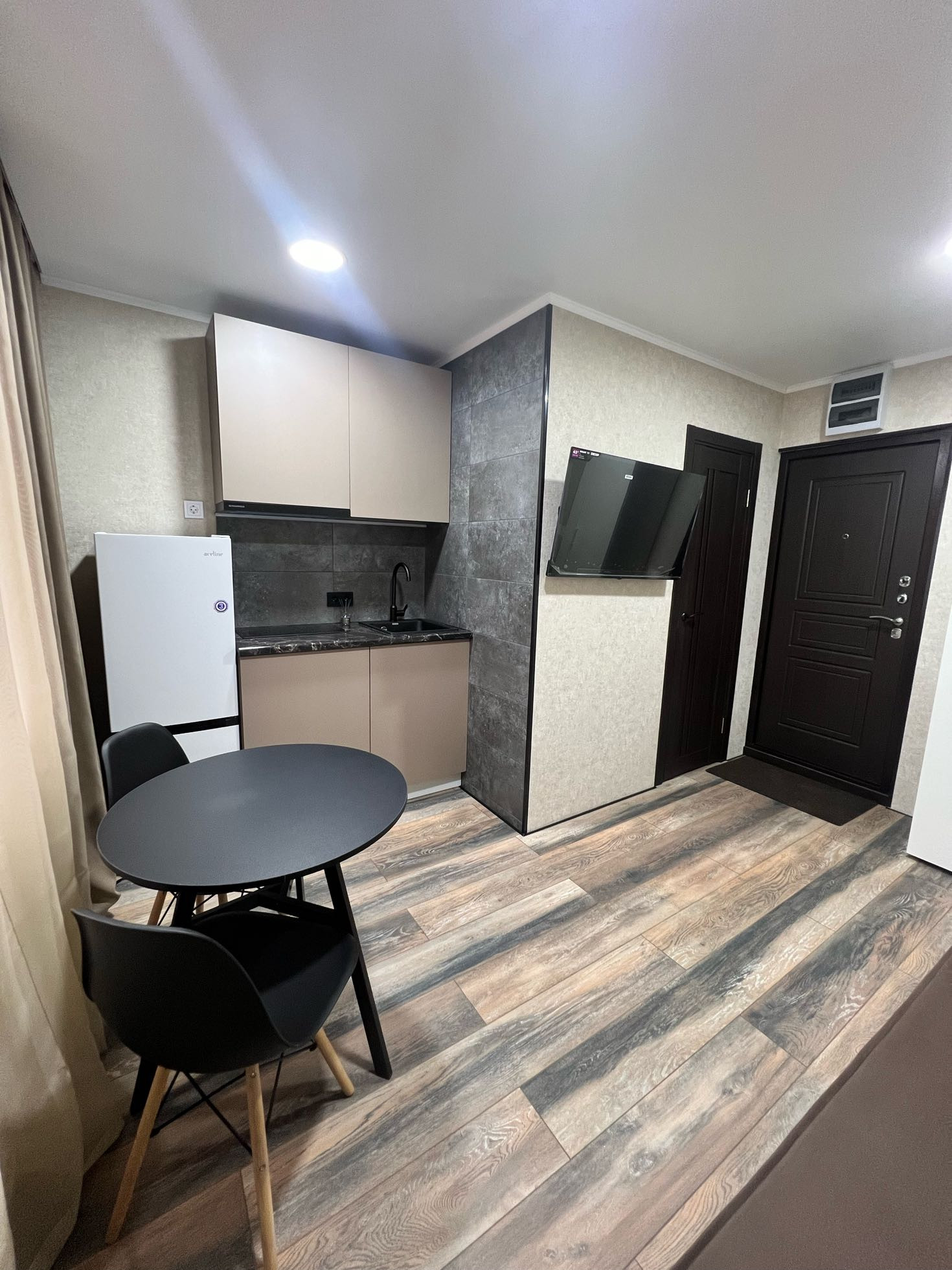 комната-студия по улице Аксакова дом № 58/1 нa 8–ом этаже 9-ти этaжного кирпичного дома, площадь 14 кв.м. После качественного ремонта: Новый диван, шкаф для одежды, обеденный стол и стулья,телевизор,стиральная машина, кухонный гарнитур,холодильник,кухонный гарнитур произведён под заказ, электрическая плита, вытяжка, фартук керамогранитная плитка. Произведен монтаж новой электропроводки.